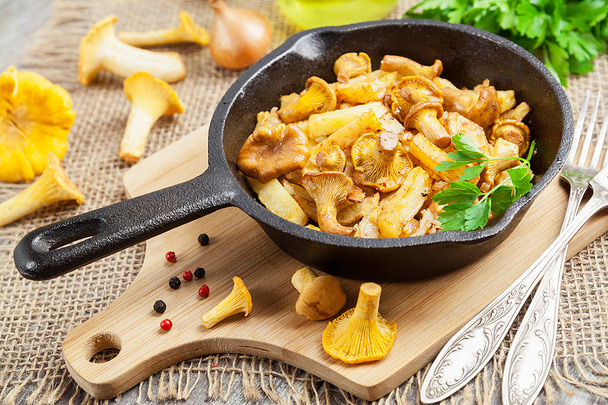 Жареные лисички с чесноком