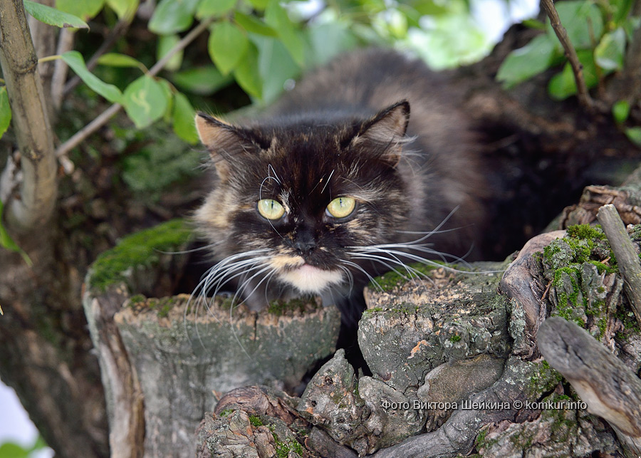 К визиту журналистов пушистая мама отнеслась настороженно. Шипела, как самовар, а потом просто спрыгнула наземь, оставив отдуваться своего малыша. Дикий, но симпатичный (и, кстати, тоже трехцветный) котенок никак не хотел позировать нашему фотокору, с таким трудом забравшемуся к нему домой.
