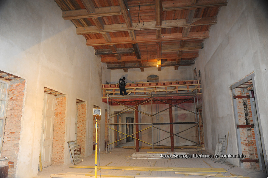 Следующая часть экскурсии проходит по тропкам между строительных лесов, уложенному на пол утеплителю, лестницам с временными перилами-досками и под аккомпанемент работающих дрелей и шлифмашинок. Прораб ЗАО «Стройпроектинвест» Валентин Михайлович Навойчик между делом (рабочий день в самом разгаре) рапортует о ходе работ: