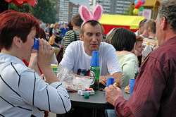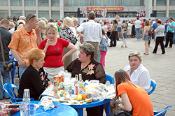 А на дворцовой площади песни лились из динамиков, светило солнышко, стелился сизый дым от мангалов, люди кочевали от ларька со смажнями к бочке с квасом. На специально расставленных скамейках восседали фанаты коллективов художественной самодеятельности Дворца искусств, которые не заставили себя долго ждать и с ходу заглушили вольный хор бобруйских пенсионеров «Играй, гармонь», распевшийся возле одного из шашлычных ларьков.
