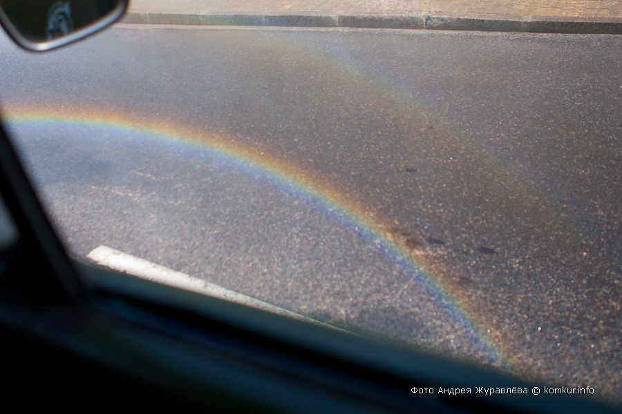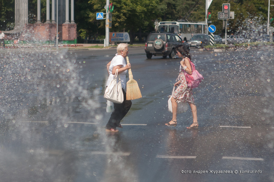 За время, что мы стояли на светофоре у Белой церкви, водитель успел выскочить и повернуть вентиль где-то в районе переднего бампера, а вернувшись на место, дернуть некую рукоятку в кабине. Есть вода! Можно выезжать на Минскую. Радуга за лобовым стеклом появилась внезапно. Стоило водителю чуть притопить педаль газа. Чем больше оборотов делает мотор, тем выше фонтан. На проезжающих машинах только успевают поднимать боковые стекла. Движущийся навстречу кабриолет благоразумно сворачивает во двор.