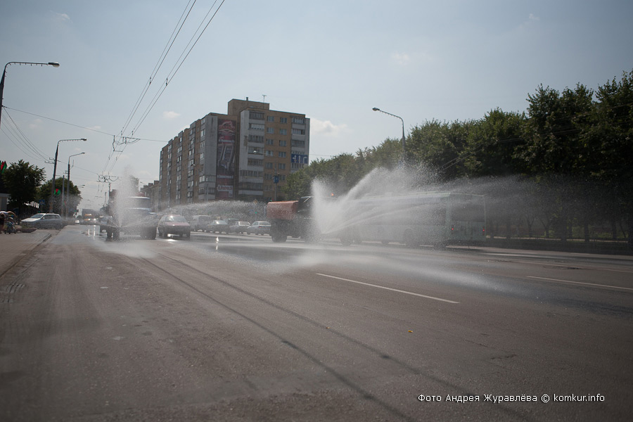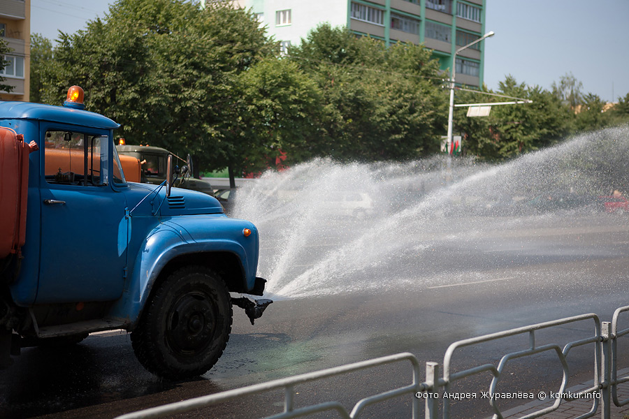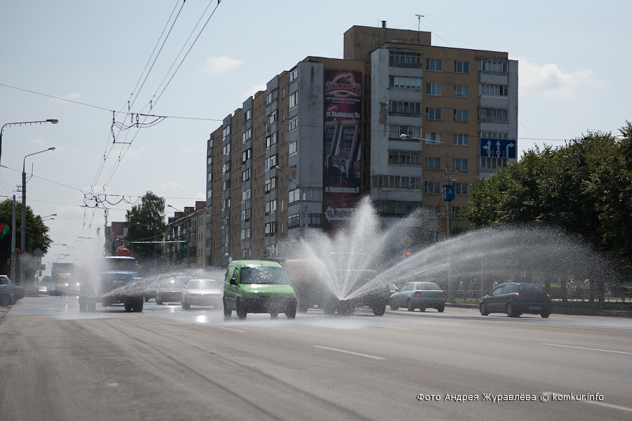 Жара в кабине при включенном распылении почти не чувствуется. Едем прямо по центру Минской. Так больше «зона охвата». Машина идет медленно, как корабль, сигнализируя о себе оранжевым проблесковым маячком. Преимуществ на дороге, согласно ПДД, он не дает. Вся надежда на сознательность водителей. А с этим у нас не всегда гладко.