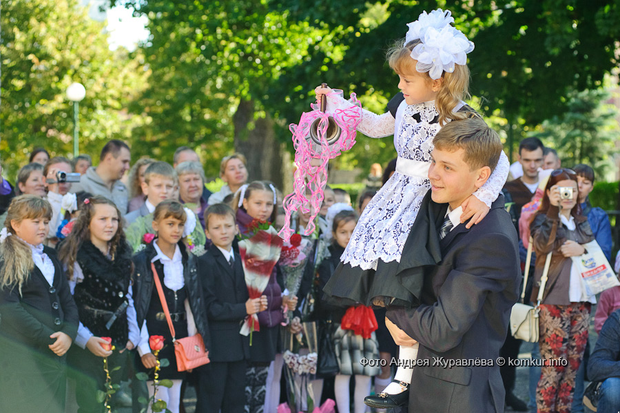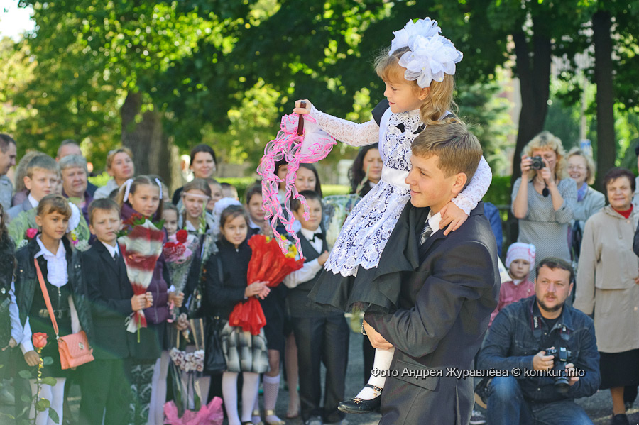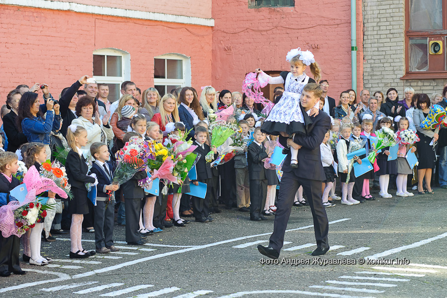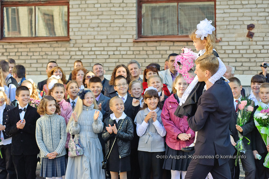 Одиннадцатиклассник Дмитрий Худовец прошел с первоклассницей Есенией Барамидзе на плече почетный круг по школьному двору. Первый звонок прозвучал!