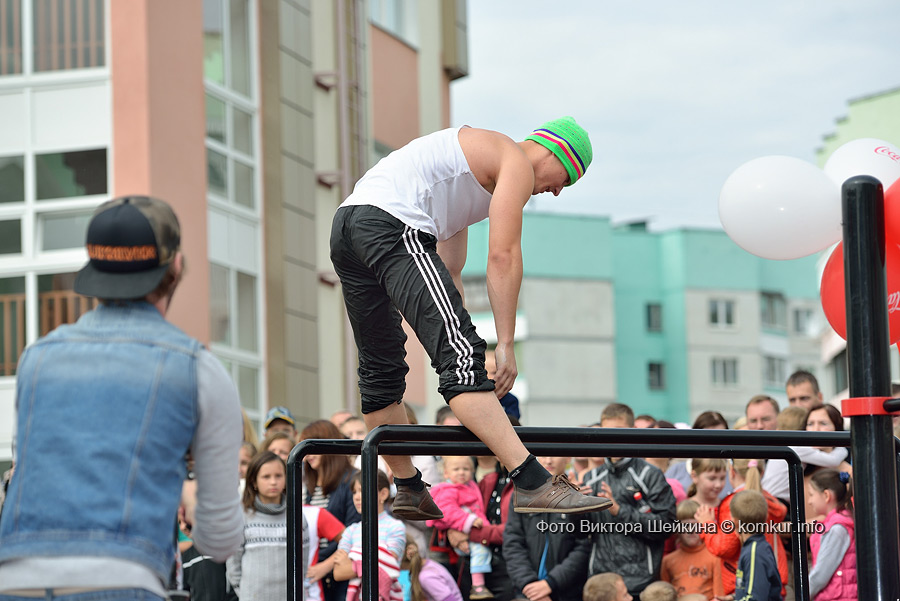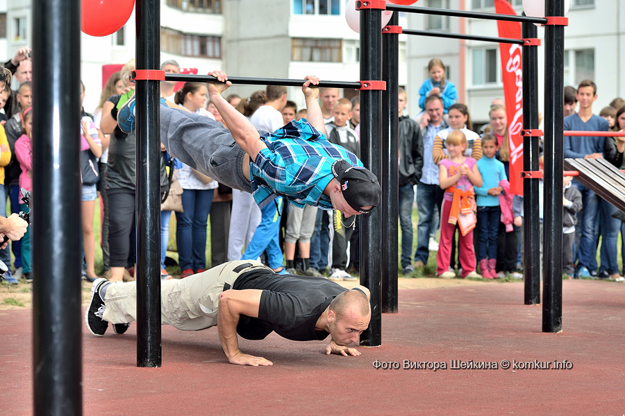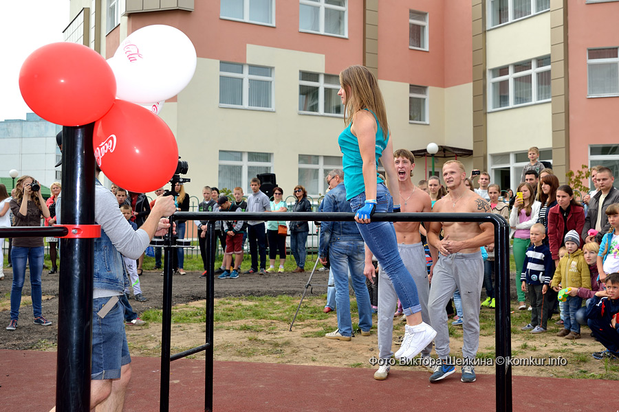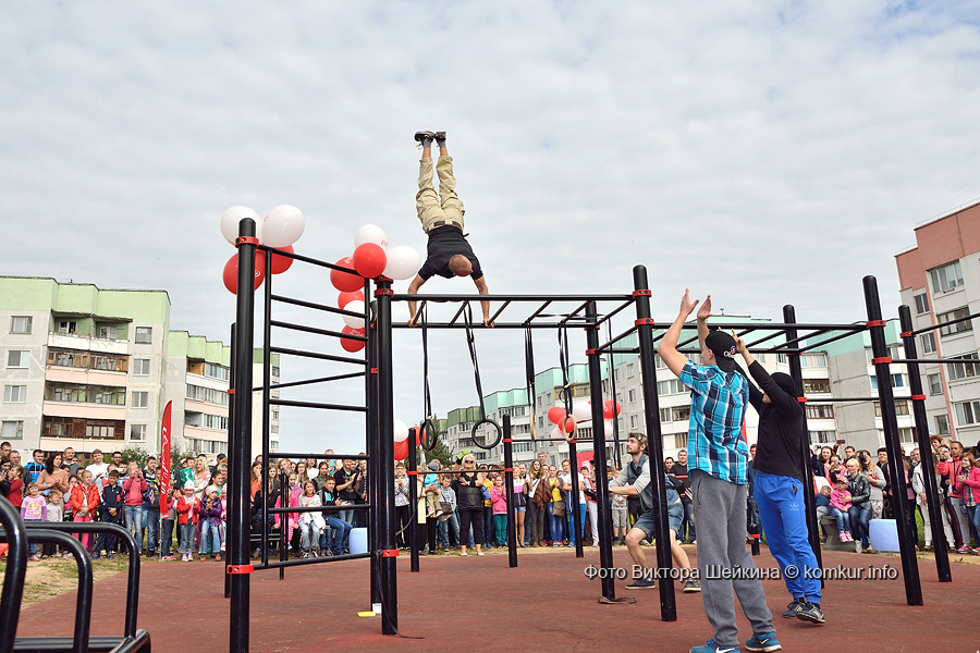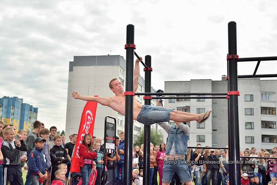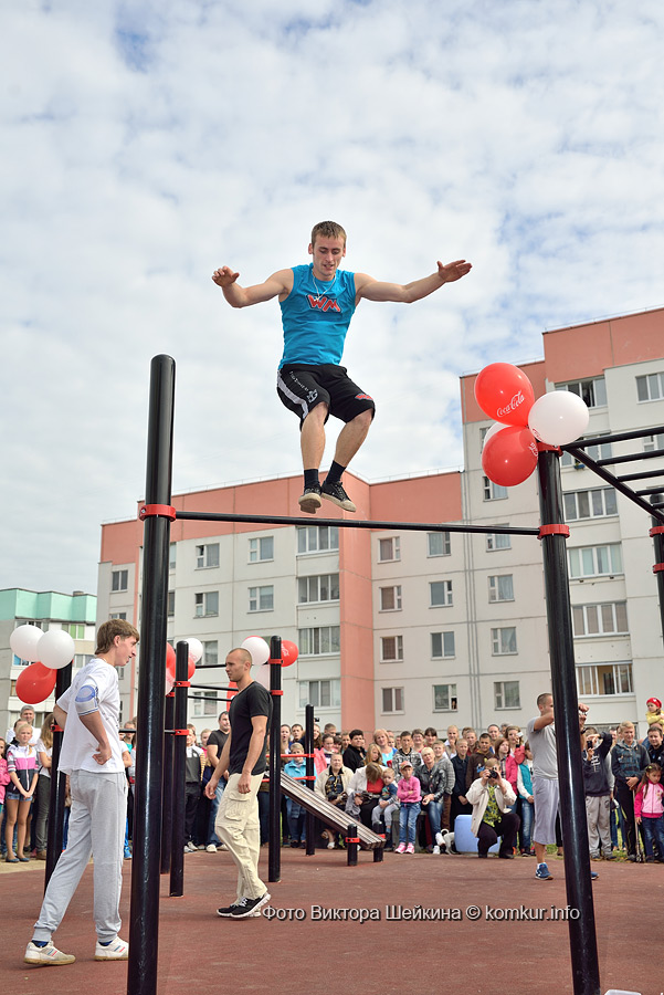 Федерация street workout собрала поклонников здорового образа жизни в этот день во дворе дома № 7 по проезду Звездному, организаторы позаботились о насыщенной программе мероприятия. Сперва под радостные овации бобруйчан и гостей города заместитель председателя горисполкома Александр Васильевич Маркачев вместе с представительницей компании Coca-Cola Анжеликой Мельниковой разрезали символическую ленточку. В открытии также приняли участие начальник управления образования, спорта и туризма Бобруйского горисполкома Ирина Николаевна Рынейская, заместитель начальника по вопросам спорта и туризма Михаил Михайлович Свистунов, замглавы администрации Первомайского района Валентина Владимировна Лихачева и секретарь Бобруйской епархии протоирей Сергий Коровинский, который освятил спортивные снаряды.