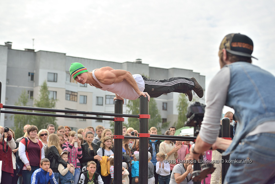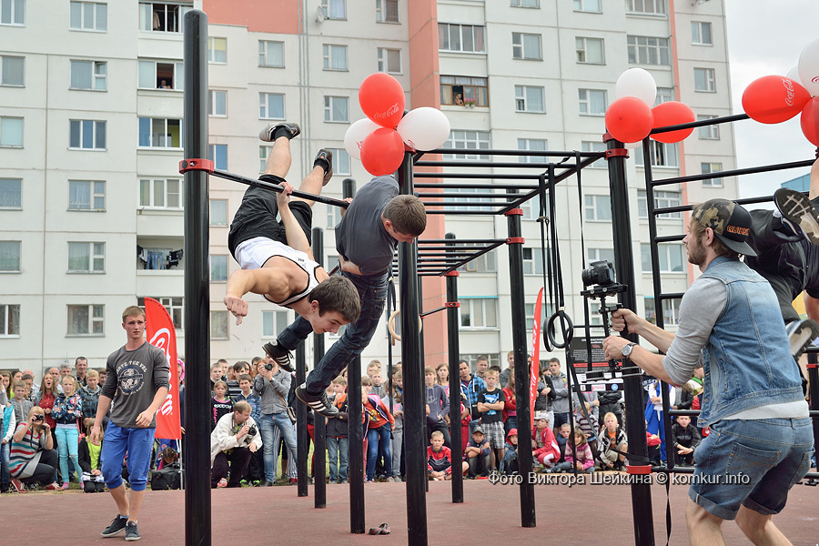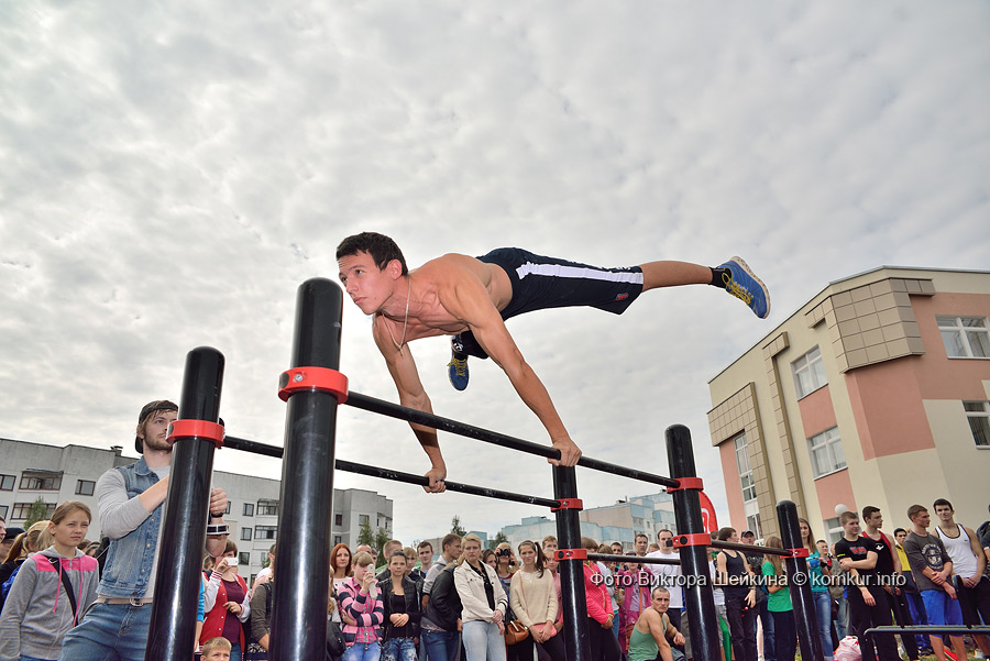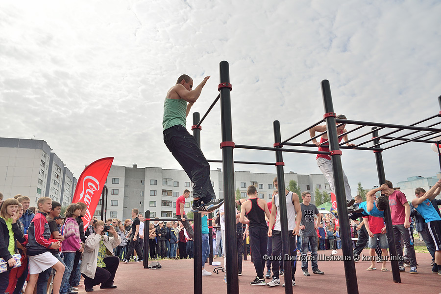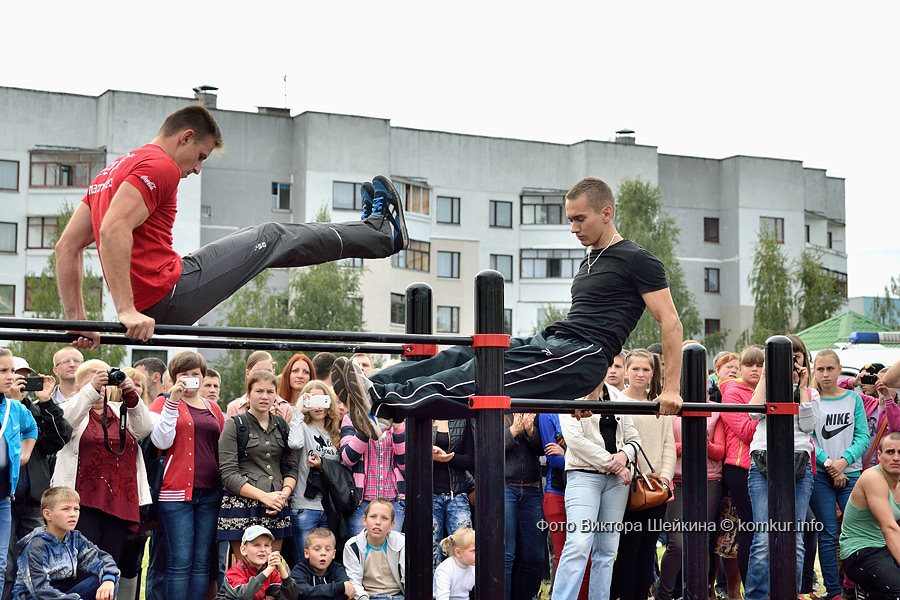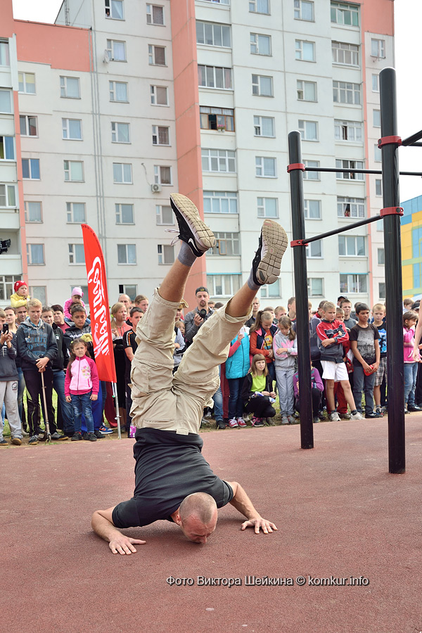 Федерация street workout собрала поклонников здорового образа жизни в этот день во дворе дома № 7 по проезду Звездному, организаторы позаботились о насыщенной программе мероприятия. Сперва под радостные овации бобруйчан и гостей города заместитель председателя горисполкома Александр Васильевич Маркачев вместе с представительницей компании Coca-Cola Анжеликой Мельниковой разрезали символическую ленточку. В открытии также приняли участие начальник управления образования, спорта и туризма Бобруйского горисполкома Ирина Николаевна Рынейская, заместитель начальника по вопросам спорта и туризма Михаил Михайлович Свистунов, замглавы администрации Первомайского района Валентина Владимировна Лихачева и секретарь Бобруйской епархии протоирей Сергий Коровинский, который освятил спортивные снаряды.