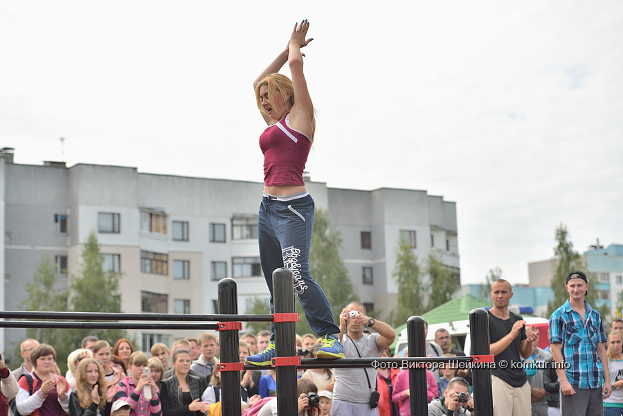Попытаюсь описать происходившее. Под трек рэпера Сявы «Все четко» двое ровных пацанчиков в туфлях и спортивных штанах с кульком семечек «брутально» появились на площадке. Спустя минуту к ним присоединился симпатичный молодой человек. Он, по всей видимости, нес культуру в массы: ведь даже подтягиваясь на турнике, продолжал читать книгу, держа ее свободной правой рукой. После выхода двух спортивных, отлично двигающихся под хит Ивана Дорна «Бигуди», девушек двое с семечками осознали всю пользу здорового образа жизни. Ребята показали класс в исполнении всех элементов. Спектакль сопровождал отлично подобранный звуковой ряд. Роли исполняли чемпионы Беларуси по командному фристайлу бобруйчане Евгений Лось, Дмитрий Куприн, Алексей Гормаш, Татьяна Куприна и Татьяна Юрковец. Порадовали публику блестящим выступлением еще две команды, обе из столицы – «SWAT» и команда Федерации street workout.