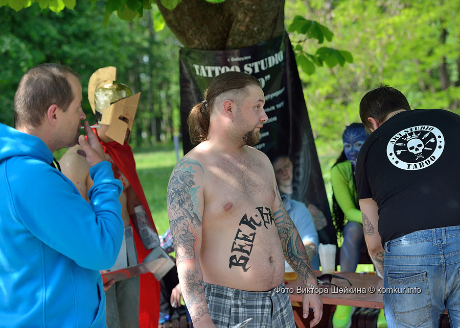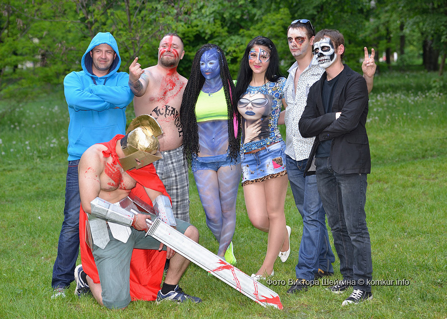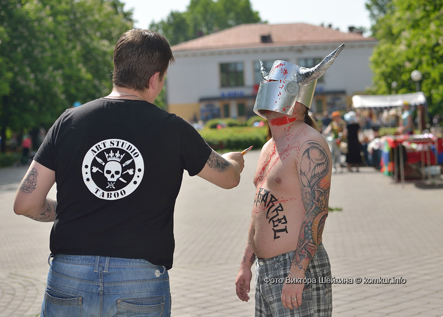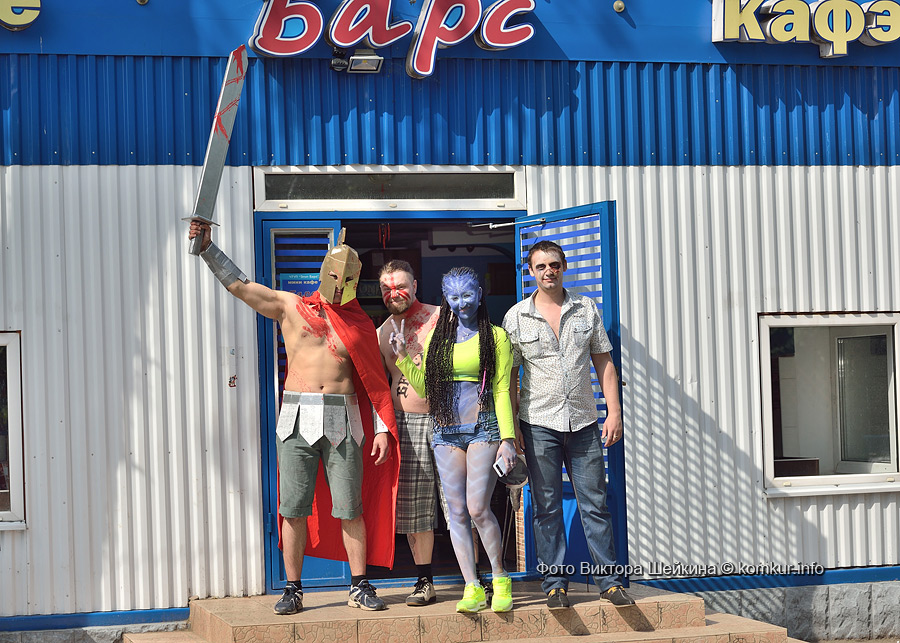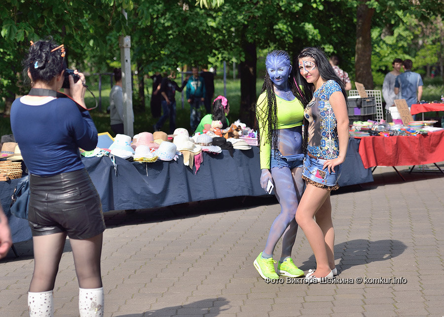 И малыши, и взрослые с удовольствием подставляли лица под кисти мастеров боди-арта. Разукрашивали желающих за небольшую плату мастер Кристина и арт-студия «Табу». Последнюю представляли абсолютно синяя девушка-аватар, викинг «в крови» и скелет. Каждые десять минут мастер «выдавал» котиков и лисичек. Я решилась сфотографироваться с веселыми татуировщиками.