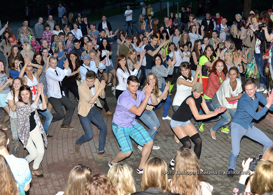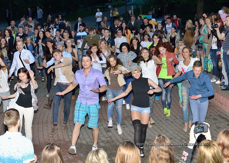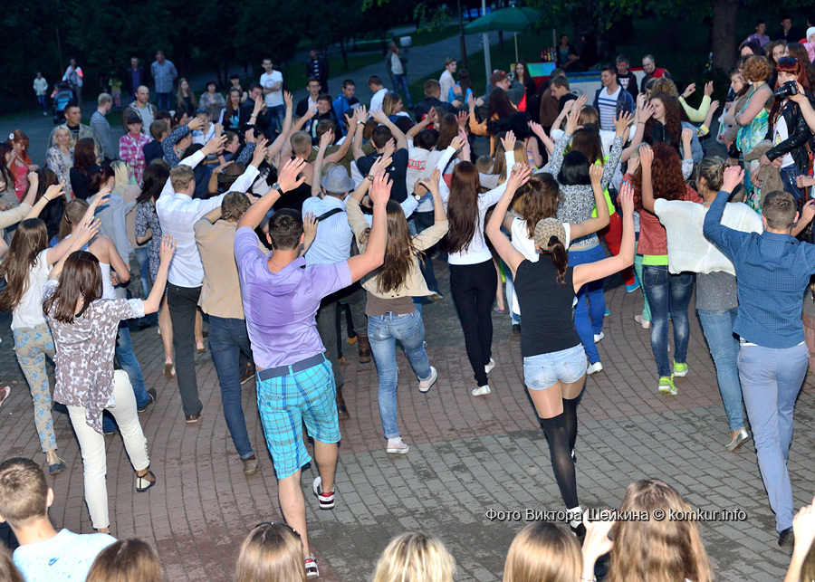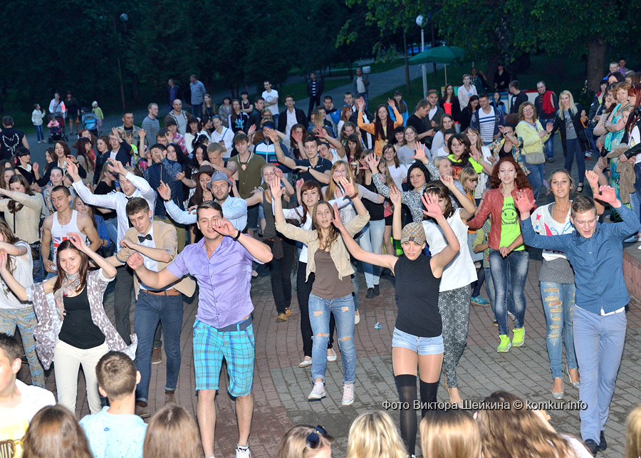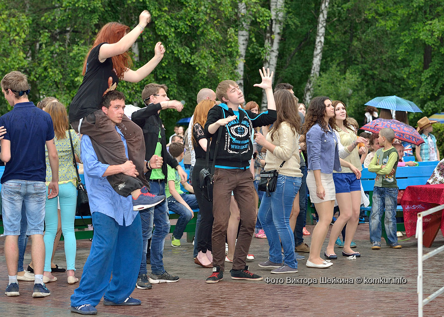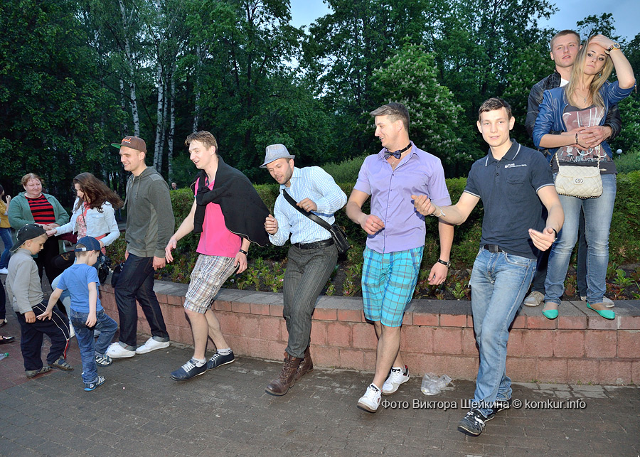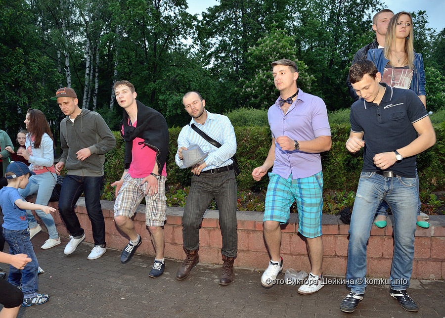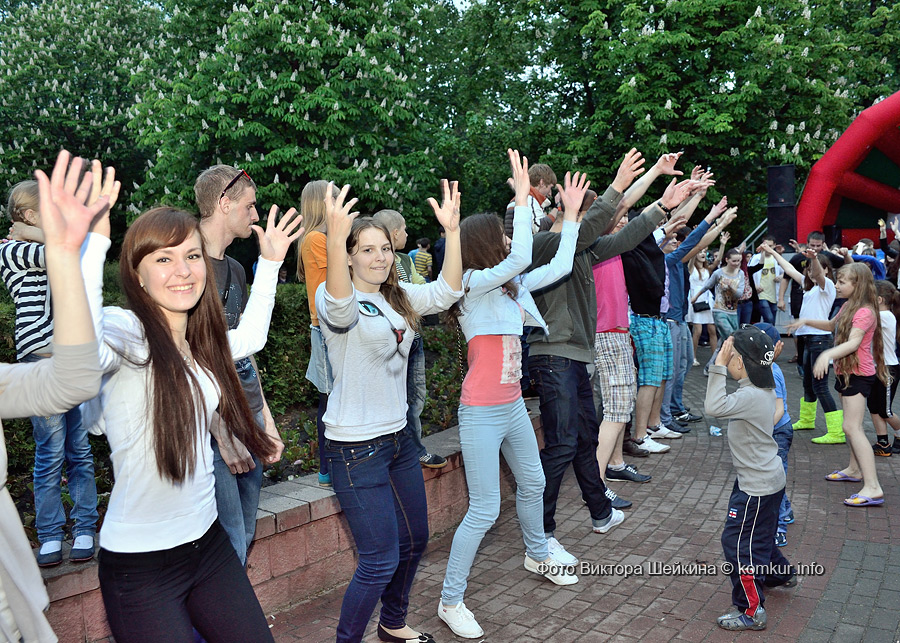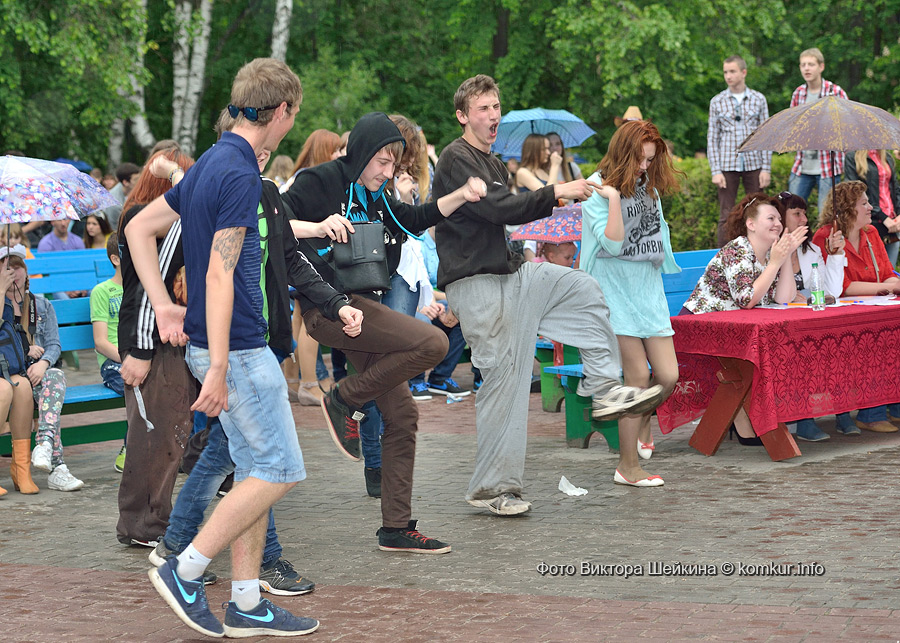 Сгустившиеся тучи и брызнувший дождь распугали не всех. Главная аллея парка опустела, зрители попрятались под козырек кинотеатра, но перед сценой осталось немало стойких и мокрых любителей танцев. Если во время выступлений танцоров и солистов двигались в такт музыки немногие, то сеты от диджеев разбудили самых сонных. Сумбурная танцплощадка постепенно набирала обороты, в центре ребята принялись показывать друг другу танцевальные движения. Первыми обучиться им с удовольствием взялись малыши, за ними подтянулась молодежь — образовав большой круг и повторяя по команде заводилы движения ногами и руками. Плавно это действо переросло в танцевальный флешмоб с заранее отрепетированными движениями.