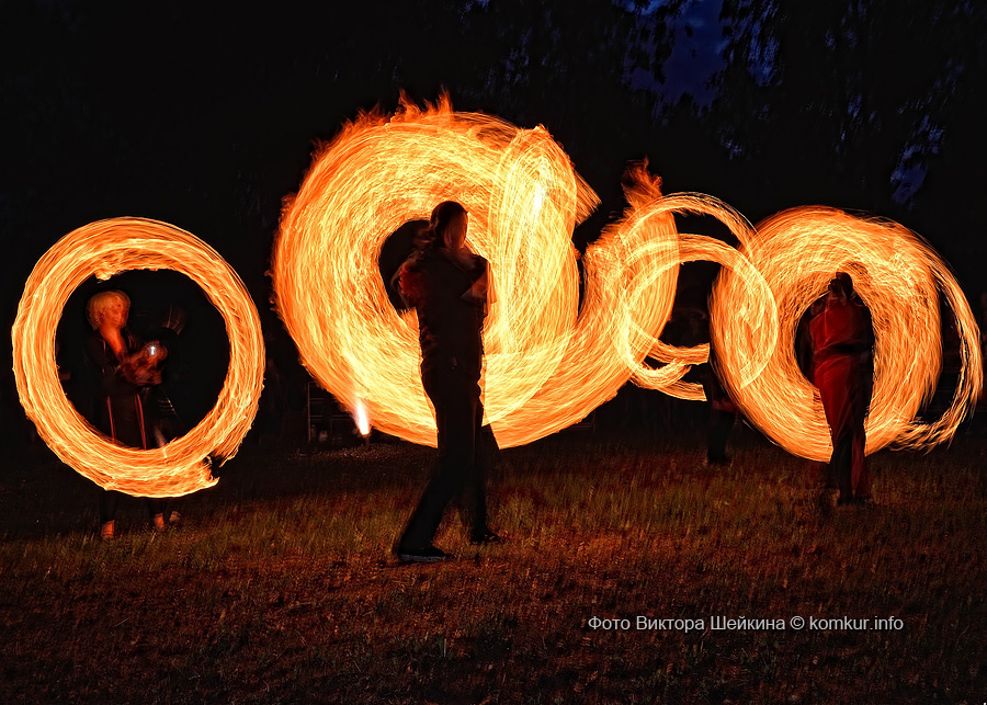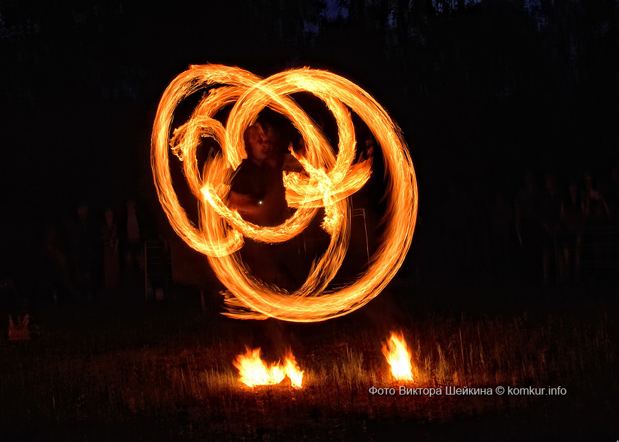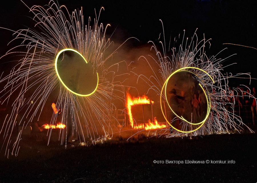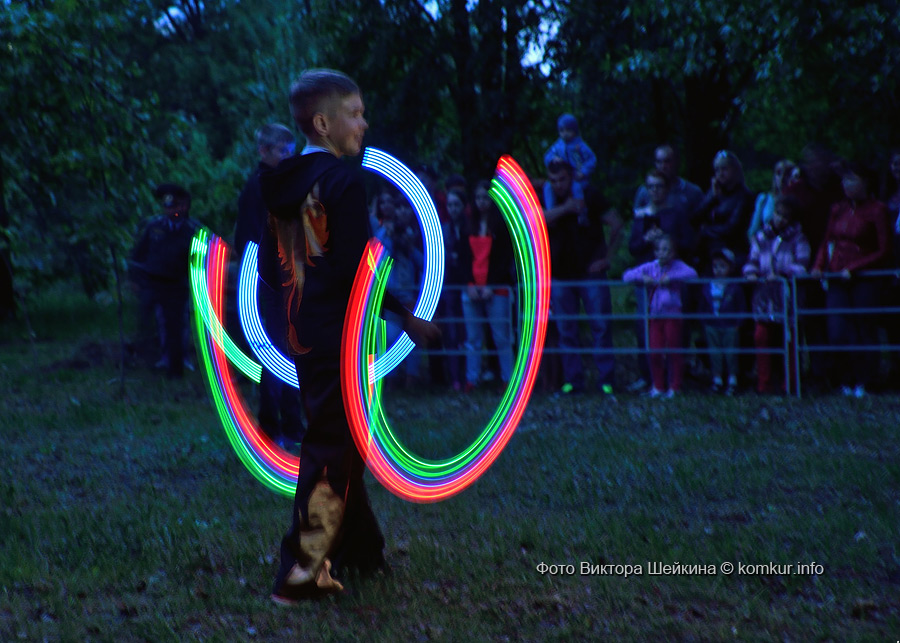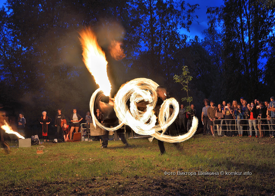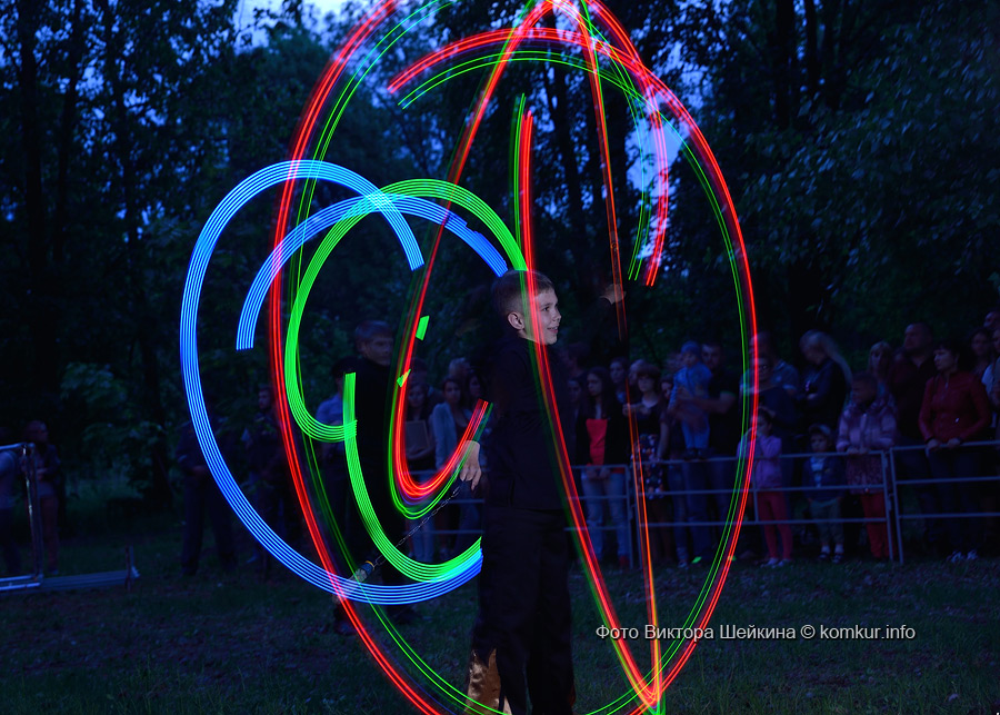 Натанцевавшись (а может, кому-то и не хватило), молодежь, уже в сумерках, двинулась за кинотеатр, где группа «Fenix» представила насыщенное файер-шоу. Мальчишки крутили фонарики, девушки танцевали с огнями в ладонях, крепкие парни жонглировали горящими снарядами и кубом. Из толпы их поддерживали: «Молодец! Красавец!». Кто-то хвастался, что тоже так умеет.
