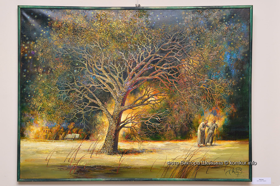 Почему-то в сюжетах, как в море, то там, то здесь, проплывают рыбы. Вот «Пейзаж» 2013 года. На нем – впечатляющее дерево, проникающее ветвями в каждый уголок жизни. Если разглядывать вблизи, отчетливо выделяется грубая кора с одной стороны дерева и гладкая с другой.