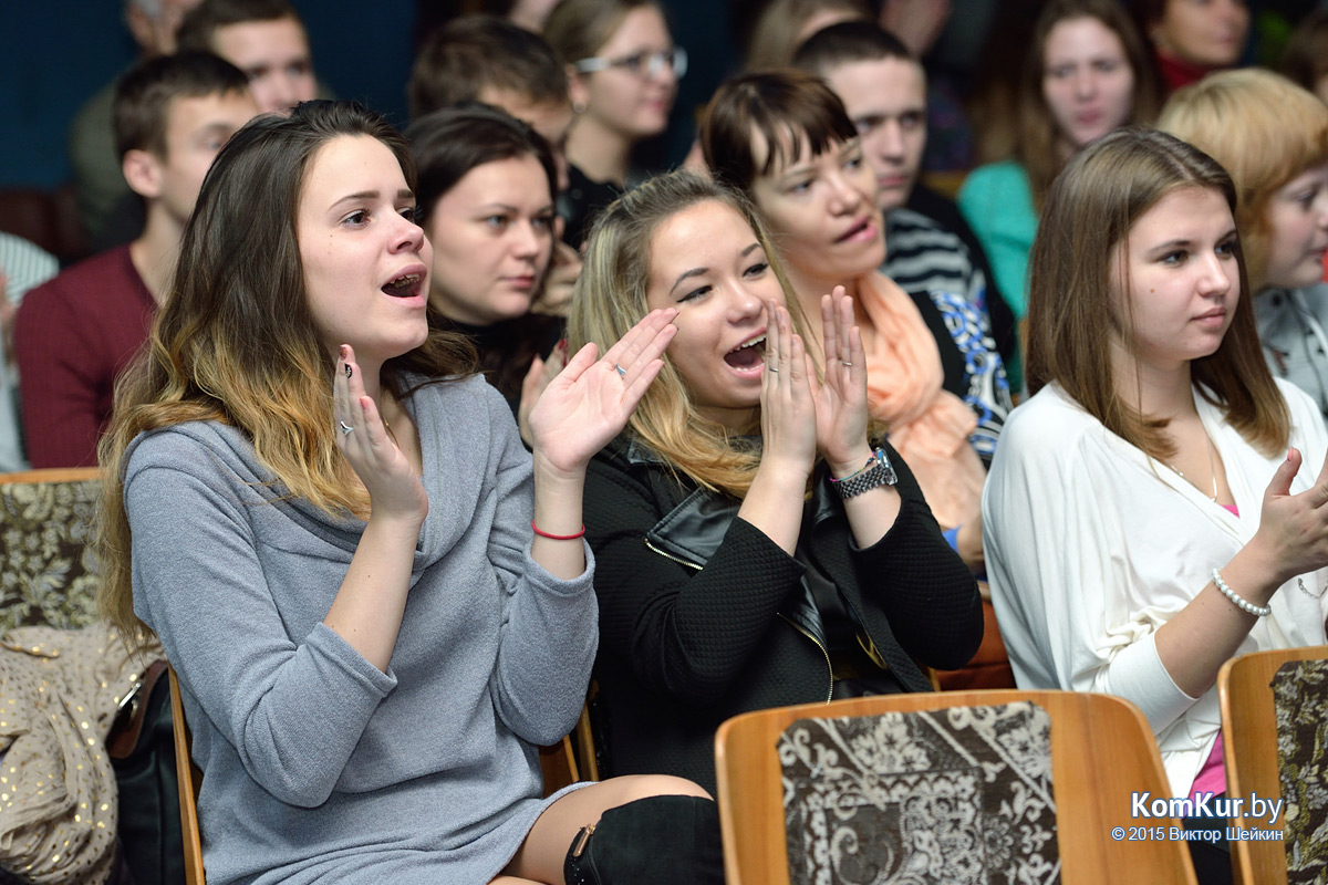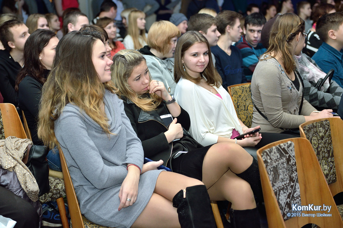 Заставил поволноваться за девушек на сцене интеллектуальный конкурс, который больше походил на конкурс остроумия. Бойкие ведущие — Алексей Хомиченок и Алеся Луканович — просто засыпали красавиц вопросами. Что тебе снилось? На что ты готова пойти ради короны победительницы? Какую книгу ты прочла? Существует ли женская дружба? Практически каждой девушке пришлось ответить, каким она представляет себе настоящего мужчину. Янина Цагельник, учащаяся Бобруйского государственного профессионального лицея № 13, например, мило призналась, что из сказочных героев соотносит себя с зайчиком, а ее «мистер» должен быть волком. А Виолетта Гуц, работница Центра творчества района, согласилась на свидание с ведущим Алексеем.
