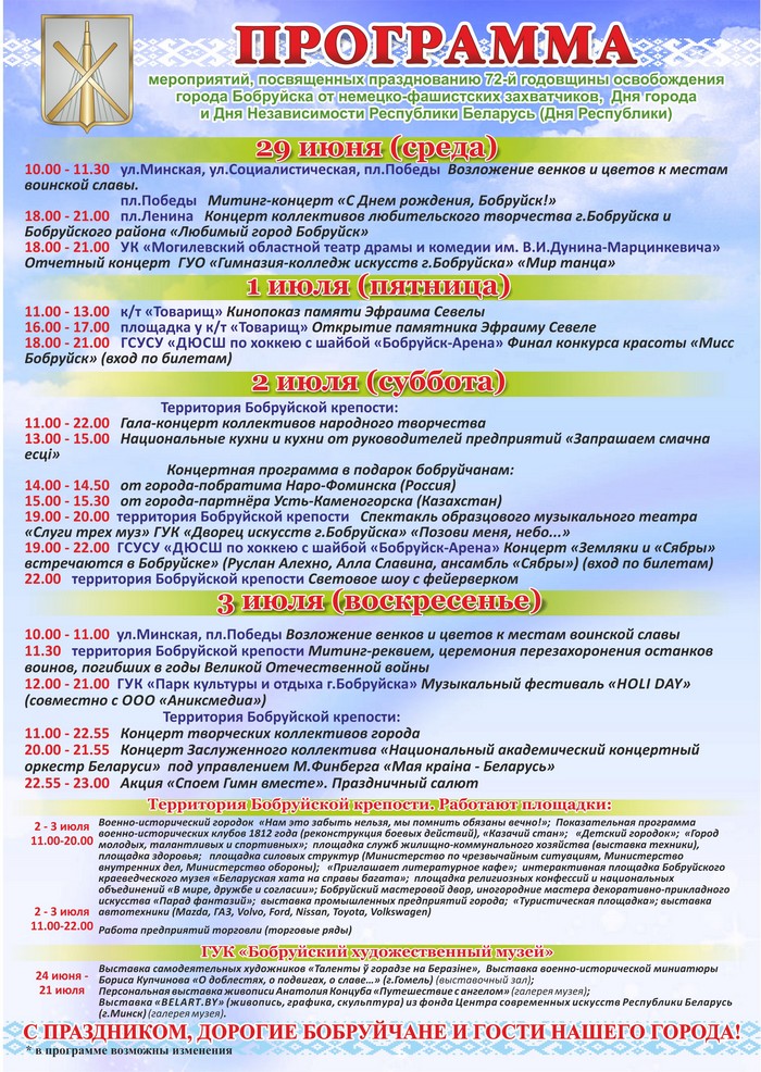 Программа мероприятий ко Дню города Бобруйска и Дню Независимости Республики Беларусь