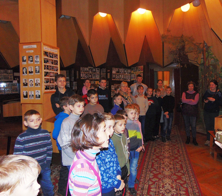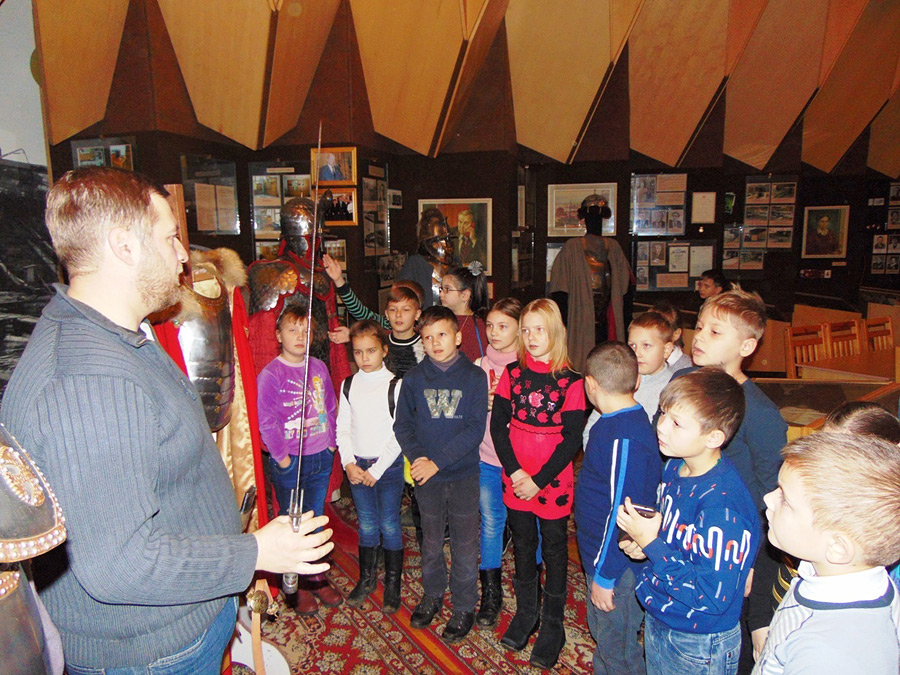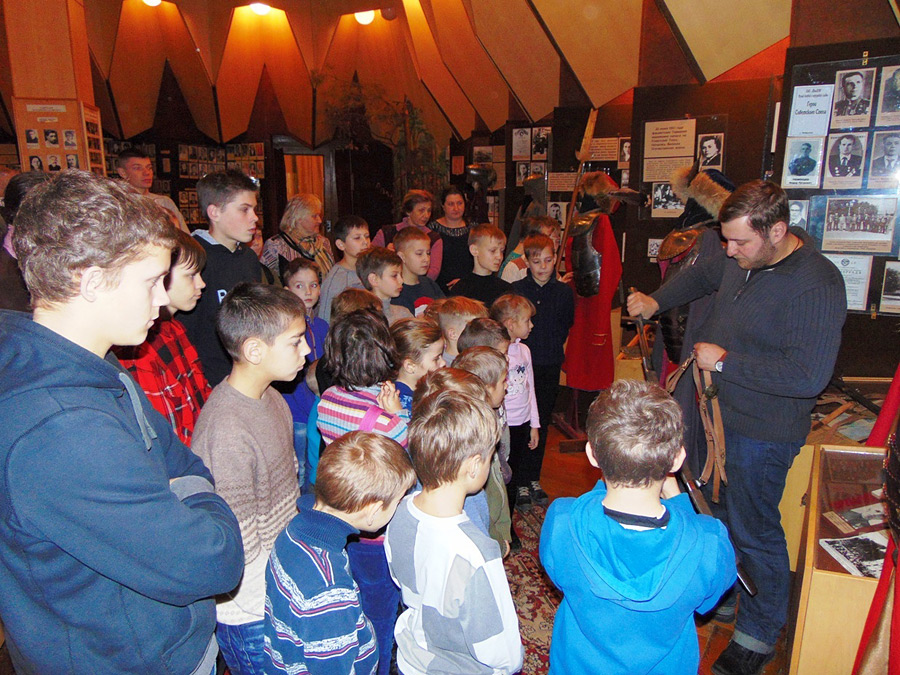 В рамках шестого школьного дня на экскурсию пришли учащиеся Центра туризма, краеведения и экскурсий детей и молодежи, СШ №19, 22, 31. Руководитель военно-исторического клуба реконструкции войны 1812 года «Цитадель» Николай Петрович Силков вместе с ребятами перенесся в эпоху рыцарей, рассказал истории тех времен. Дети узнали, как на поле боя отличали врага от союзника, значение знамени и многое другое.