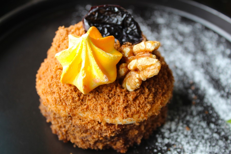 Десерт сета – мини-тортик «Графские развалины». Да, тот самый советский, готовили который по большим праздникам или на день рождения, потому что для него нужны были и сгущенка, и чернослив, и грецкие орехи – сплошь дефицитные продукты. Поэтому часто заменяли их на то, что удалось «достать». Именно этим и объясняют такое большое количество разных по составу рецептов «Графских развалин». Вариант от «Цоколя» – нежный в меру сладкий с орехово-шоколадным вкусом хорошо пропитанный сиропом слоеный бисквит с нежной прослойкой из чернослива. И хоть по форме он не напоминал классические «развалины», вкус его был вершиной того «графского», который в детстве готовила мама всю ночь, чтобы подать к обеденному праздничному столу.