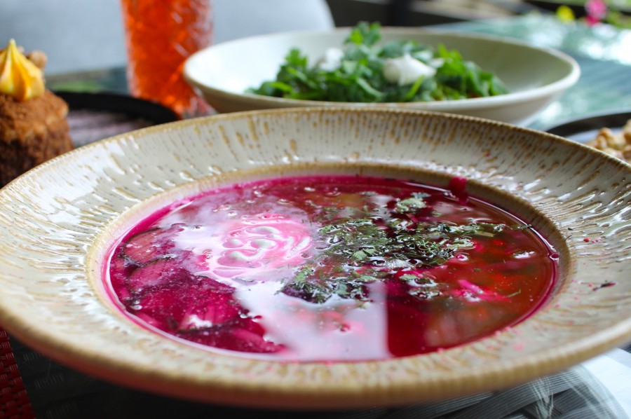 Возьмем тот же холодник – с детства знакомый легкий свекольный супчик для жаркого лета. В «Цоколе» в него добавили песто – такой соус на основе оливкового масла с сыром пармезан и мелко нарезанным базиликом. И сразу холодник заиграл совсем иными вкусовыми оттенками: он стал ароматнее, гуще, нежнее – появился мягкий и одновременно пикантный вкус. И это уже совсем другой холодник, а точнее его королевский вариант, оставляющий приятное послевкусие.