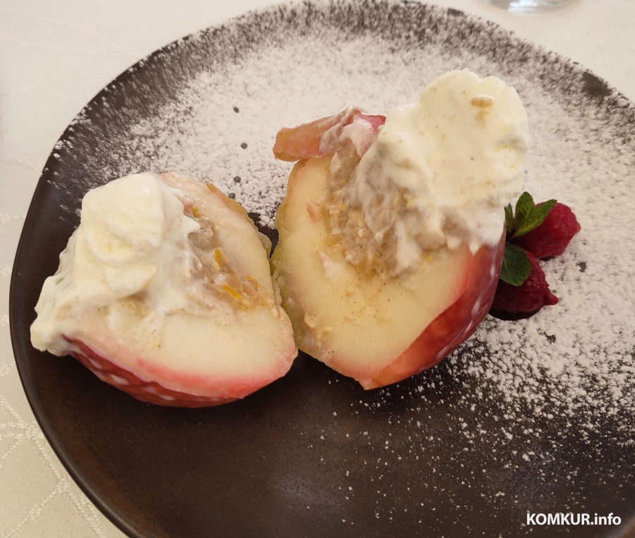 На десерт шеф-повар решил приготовить очень уютное блюдо – карамелизированное яблоко с мороженым. Получилось оно что надо: крепкое, но в то же время мягкое. Внутри пряталась секретная начинка с цитрусовой ноткой.