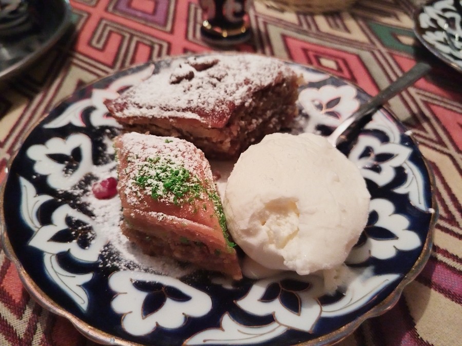 - Пахлава с мороженым (восточная сладость из слоеного теста с прослойкой из тертых орехов, сахара и кардамона)