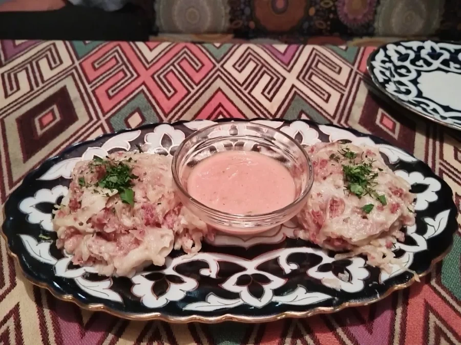 Урама ханум. Передо мной оказалась тарелка, которая будто сошла со страниц восточной кулинарной книги. Два аккуратных рулета из тонкого пресного теста, щедро посыпанные свежей зеленью, выглядели словно маленькие произведения кулинарного искусства. В центре – соус нежно-розового цвета, явно со сметанной основой, с пикантной остринкой, судя по всему, благодаря перцу или паприке.