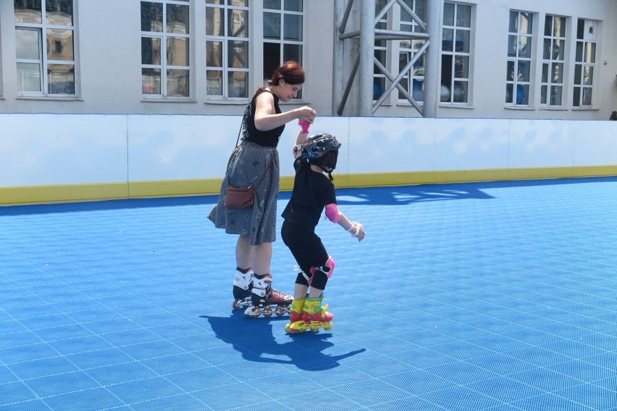 Сам каток представляет собой довольно просторную площадку со специальным покрытием, на которое не больно падать. Места хватает и для тех, кто уверенно гоняет змейкой, и для тех, кто делает первые шаги с характерными взмахами рук (это мы).