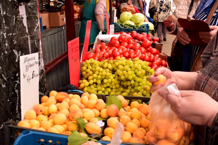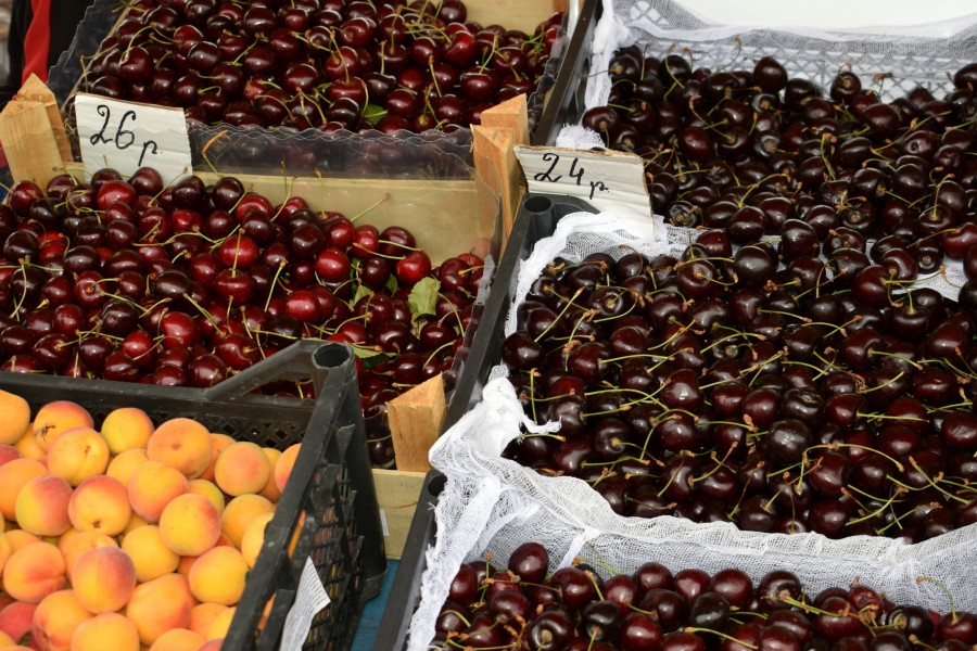 Еще удивляет заметный разброс цен на некоторые товары. Так, та гигантская (но словно полежалая) редиска может быть 3,50, а может и 2,80 за килограмм (обычная маленькая – полтора рубля за пучок), огурцы от 2,50 до 5 рублей (но тут по размерам), абрикосы – 6,50 и 10 руб./кг, черешня бывает и 16 рублей, и 26, сливы и по 13, и по 4,50!