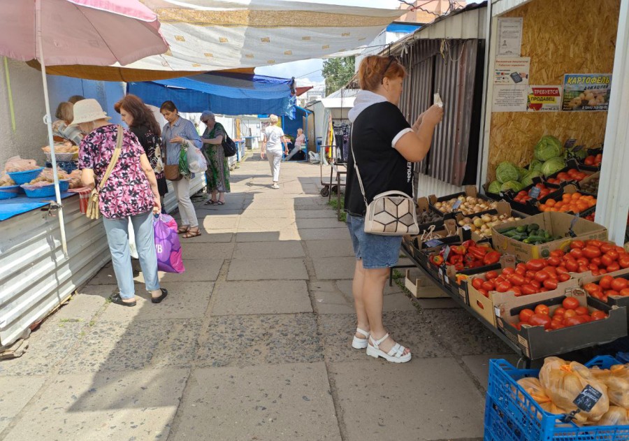 Овощные ряды рынка стали богаче: много томатов: крупных, средних, черри, желтых, розовых, красных. Цена – от 4 до 9 рублей. Много огурцов – продают ИП, фермеры и бабулечки-дедулечки свои излишки.