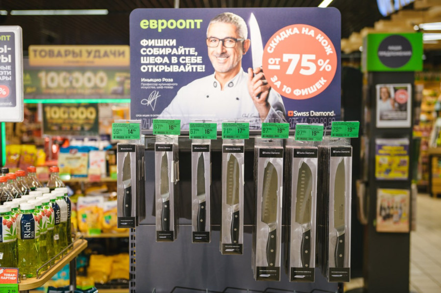Фишки за покупки начисляются с 13 октября по 7 декабря во всех магазинах «Евроопт». Список магазинов, в которых можно приобрести ножи со скидкой от 75% с 13 октября по 14 декабря, проверяйте на сайте nozhi.evroopt.by.