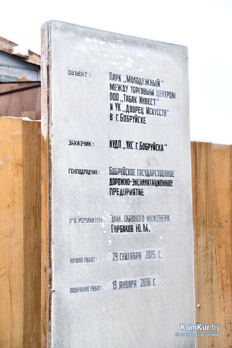 В минувшем году в Бобруйске был заложен Молодежный парк. Согласно проекту, первая его очередь — а это центральная аллея с фонтаном и инженерными сооружениями, ротонда, площадка для пикников, альпийская горка, установка телемонитора, питьевых фонтанчиков, парковки и велопарковки — должна быть сдана в январе этого года.
