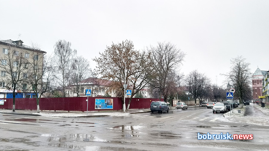 Стальной пояс забора появился на пятачке напротив городской больницы СМП им. В. Морзона, точнее – на пересечении улиц Пролетарской и Октябрьской. Когда-то здесь была прачечная Бобруйского дома ребенка и киоск с кока-колой и хот-догами.