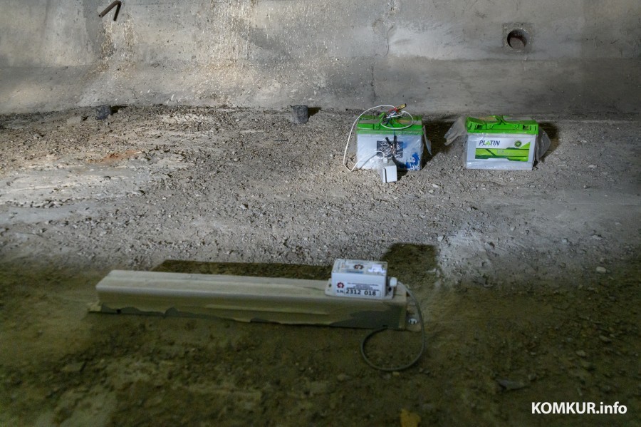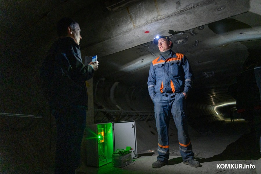 На том конце тоннеля – свет. Это не поезд, это налобные фонари специалистов БелДорНИИ. Они тоже здесь уже отметились. Исключительно позитивно. На «полу» каждого строения установлен специальный датчик – продолговатое устройство, длиною чуть более полуметра, а стены отмечены красными штрихами.