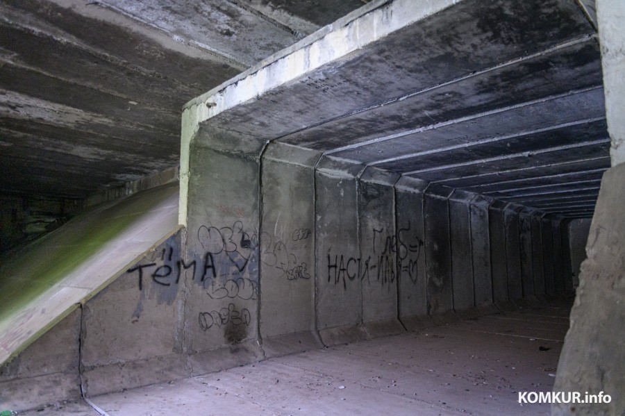 Внутри железная лестница, после еще одна. Поворот направо и взору предстает длиннющий темный тоннель. Единственными источниками света служат круглые отверстия, похожие на иллюминаторы. Солнечный свет пытается буквально протиснуться в бетонную амбразуру. Так изнутри и выглядит неразрезное мостовое строение коробчатого сечения.