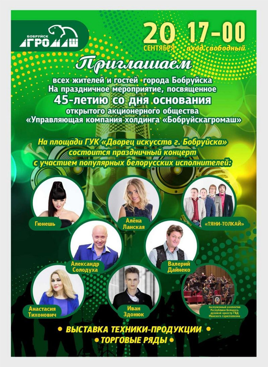 В пятницу, 20 сентября, ОАО «Управляющая компания холдинга «Бобруйскагромаш» отметит 45 лет со дня основания.