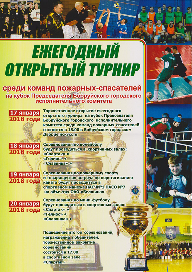Традиционно в январе в Бобруйске проводится ежегодный открытый турнир по мини-футболу, волейболу и пожарному спорту на кубок председателя Бобруйского городского исполнительного комитета среди подразделений пожарных-спасателей. Он посвящен Дню спасателя Республики Беларусь, который отмечается 19 января.