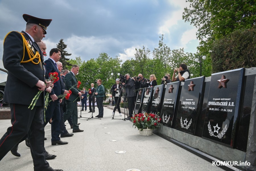 Вспомнил мэр и шестерых героев, похороненных у подножия легендарного Т-34. Это и генерал Борис Сергеевич Бахаров, чей танковый корпус летом 44-го не дал вермахту уйти из бобруйского котла, и погибшие при освобождении Бобруйска подполковник Герасим Никитич Логачев и старшина Николай Иванович Барышев. И братья-бобруйчане Прибыльские: подполковник Анатолий Петрович погиб «в полях за Вислой сонной», при наступлении на Берлин принял свой последний бой старший лейтенант Аркадий Прибыльский. В Германии в берлинской операции сложил голову Константин Константинович Воробьев. К танку и могилам павших легли цветы и венки от гостей и участников церимонии.