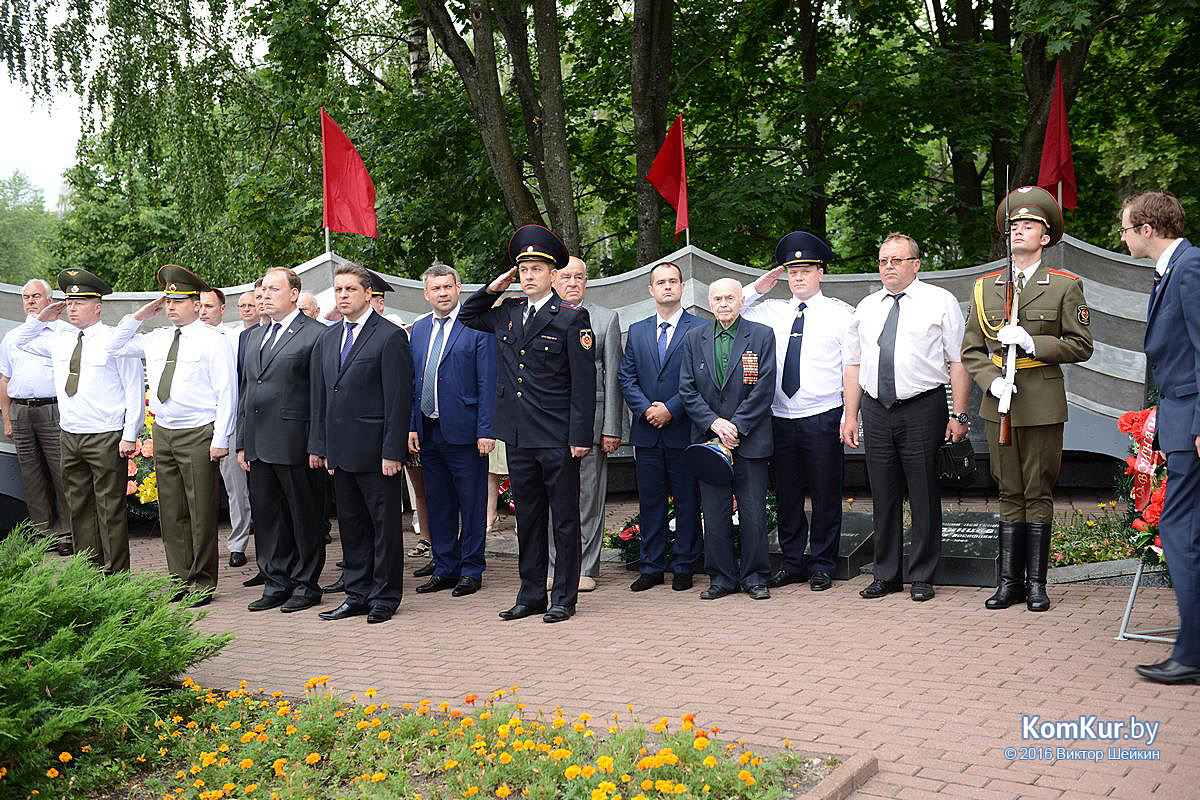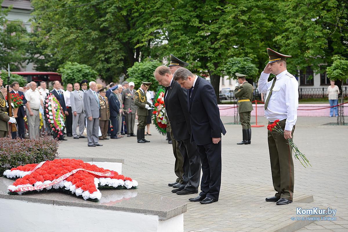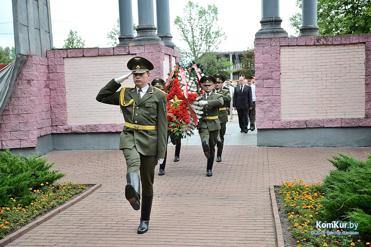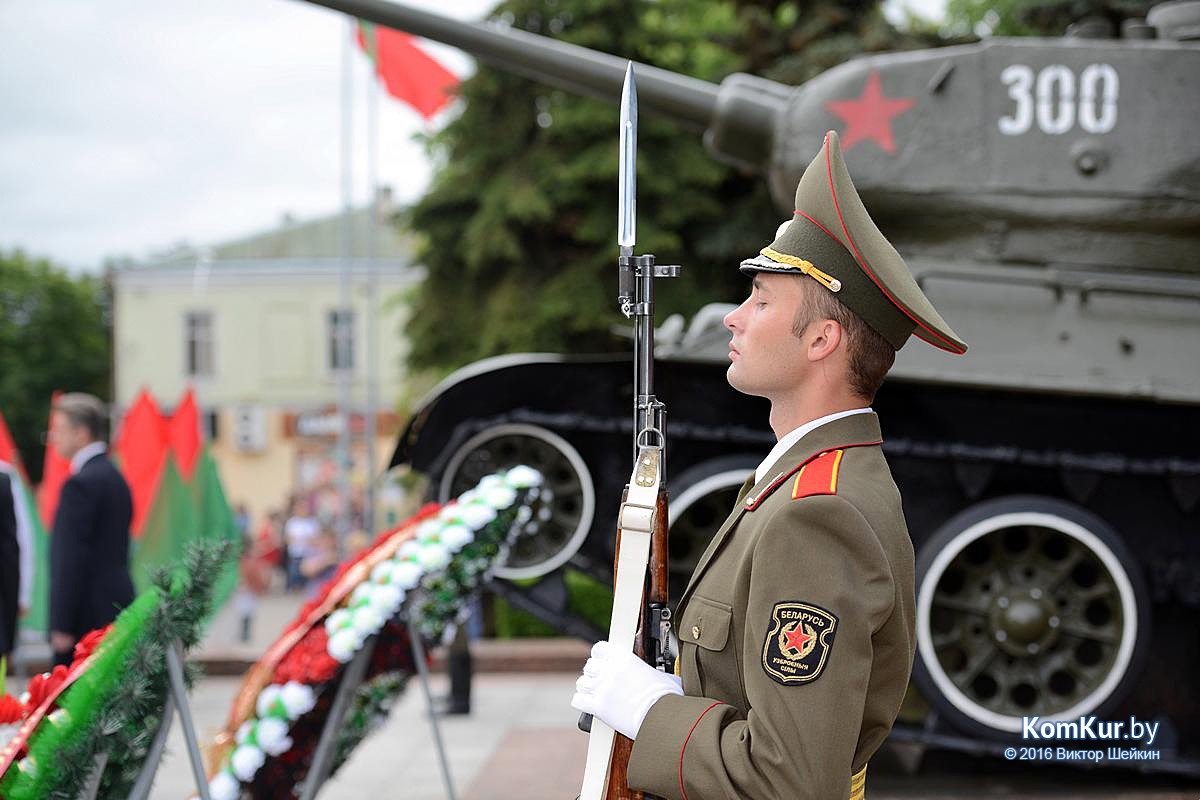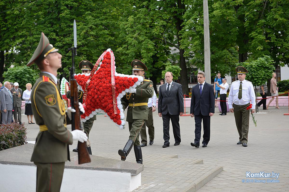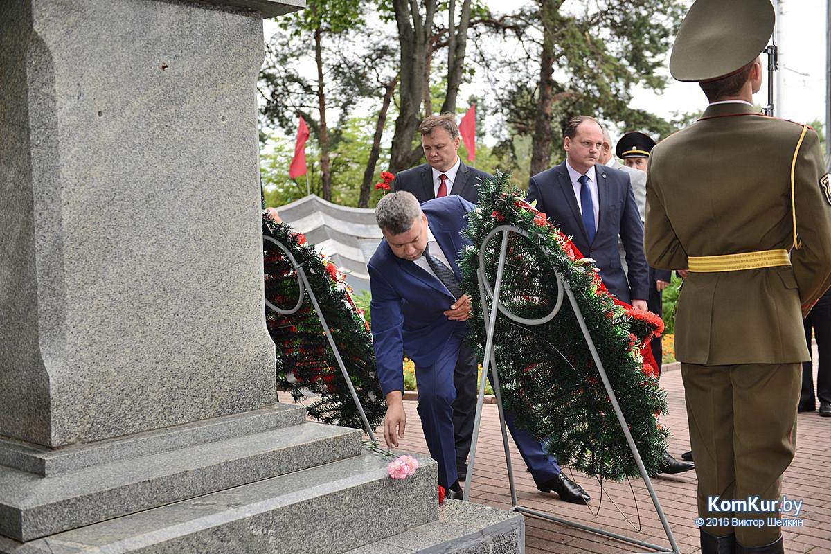 Начался праздник у мемориала воинам-освободителям на улице Минской. Председатель Бобруйского горисполкома Андрей Викторович Коваленко, первый заместитель председателя Олег Валериевич Ковель, заместитель председателя Александр Васильевич Маркачев, глава администрации Ленинского района Александр Николаевич Лисовский, глава администрации Первомайского района Юрий Станиславович Хилинский, председатель Бобруйского городского совета депутатов Михаил Викторович Желудов, а также ветераны войны и труда, военные, представители трудовых коллективов возложили цветы и венки.
