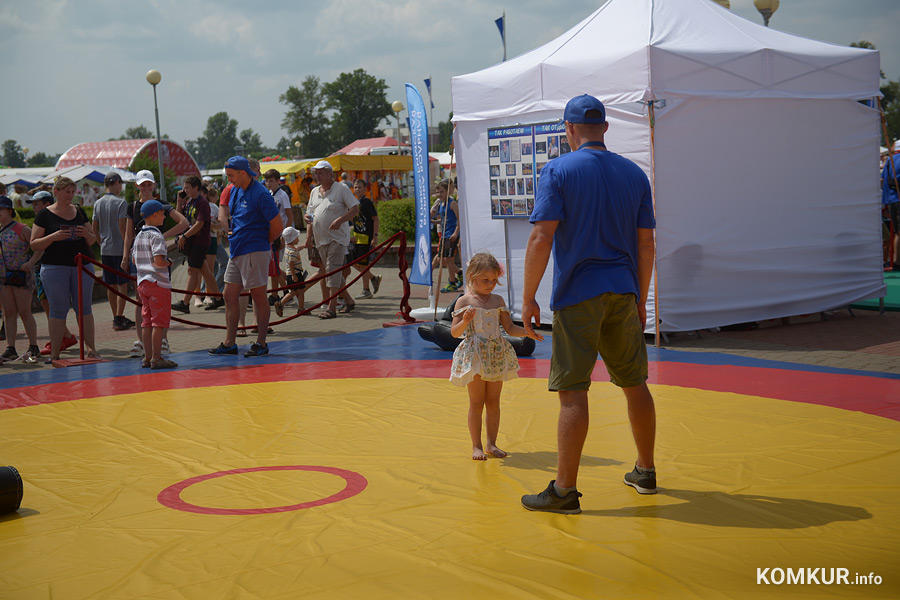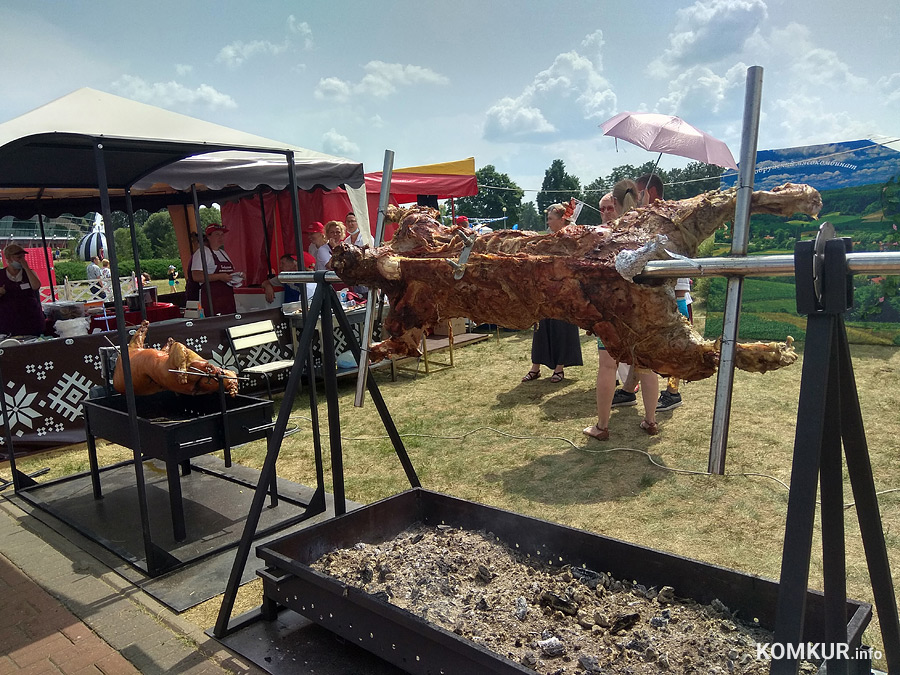 Длинные ряды палаток и столиков под навесами, где можно перекусить и утолить жажду. Шашлыки, шаурма, выпечка, овощи-фрукты, квас и много других угощений. А у палаток Бобруйского мясокомбината и «Бабушкиной крынки» на больших вертелах даже жарят поросят и телят!