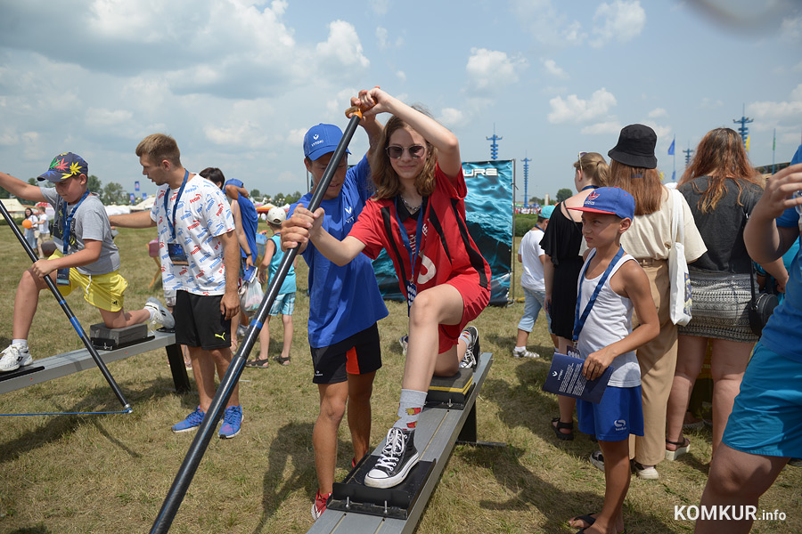 У палатки бобруйских гребцов установили гребные тренажеры – насколько это трудный вид спорта, каждый желающий может испытать на себе.