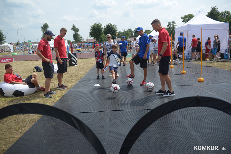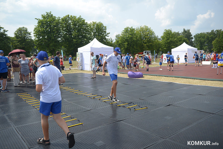 Бобруйский городской физкультурно-спортивный клуб поставил стойку для армрестлинга. А федерация футбола организовала соревнования «Мама, папа, я – спортивная семья». Конечно, расставили столики для игры в шахматы и шашки.