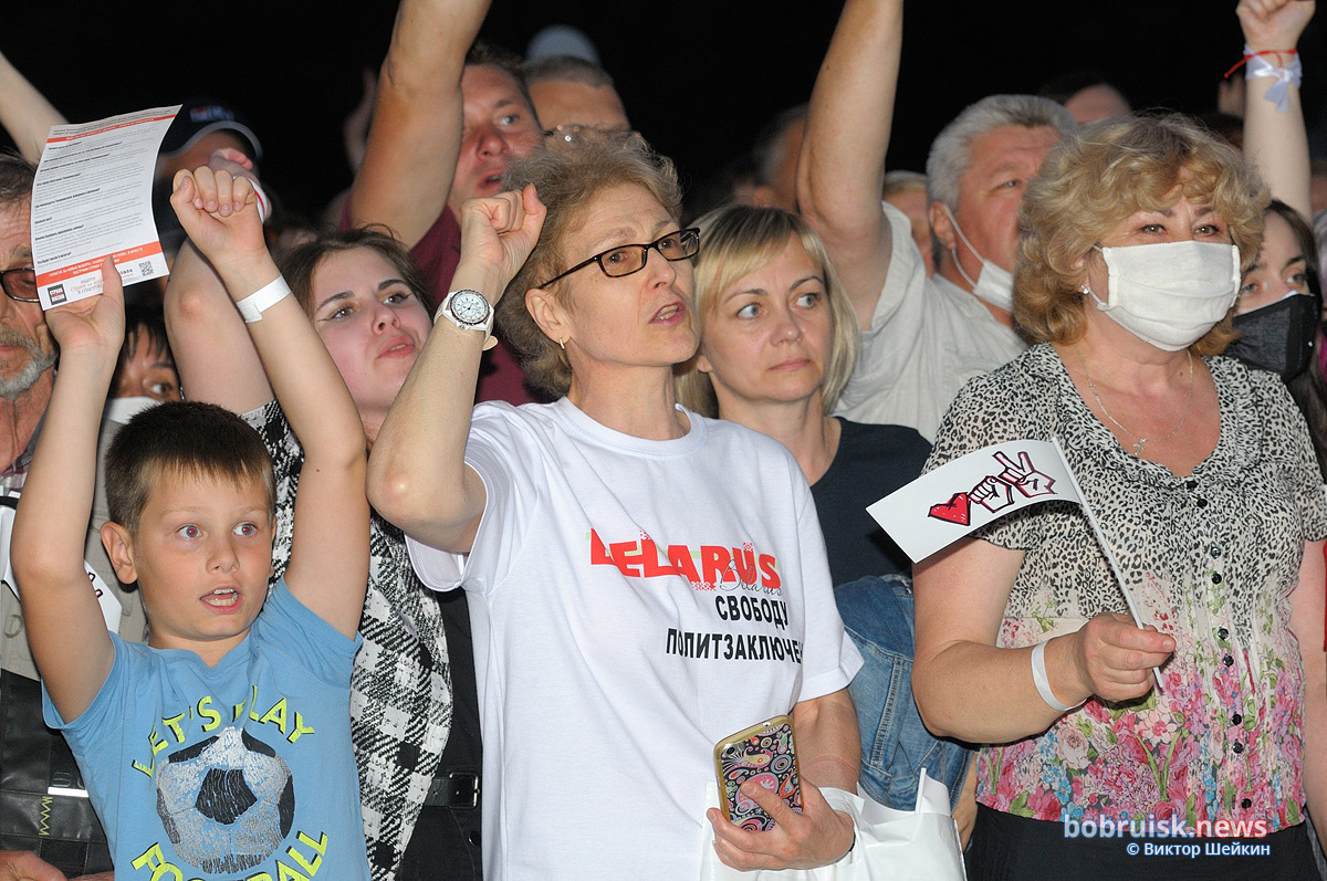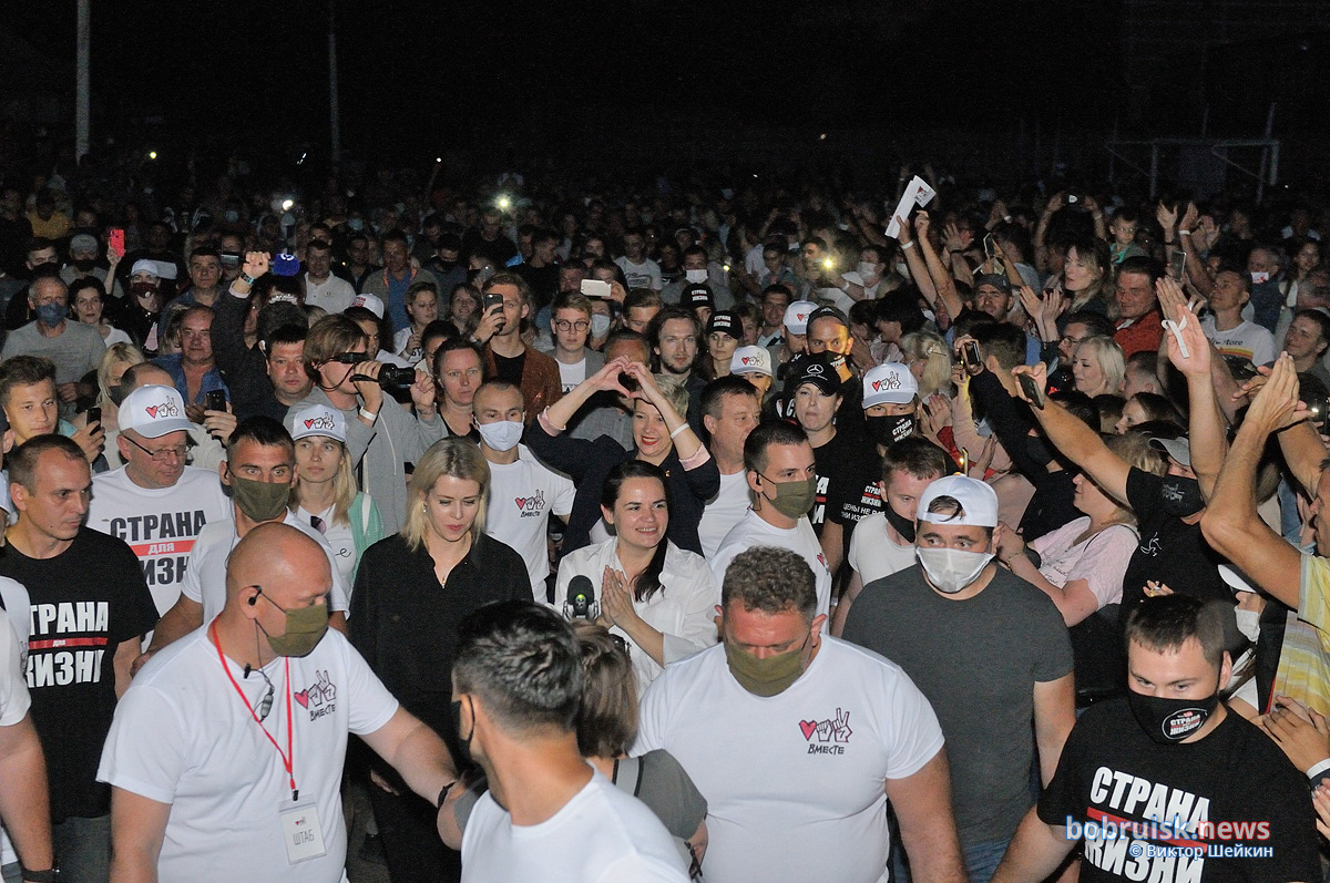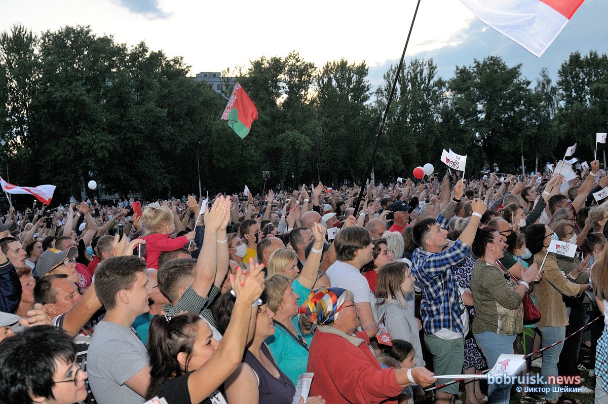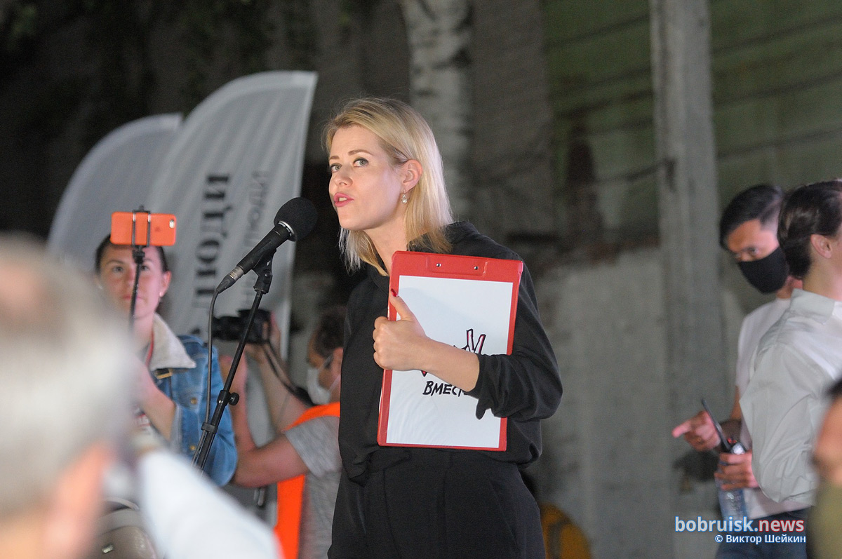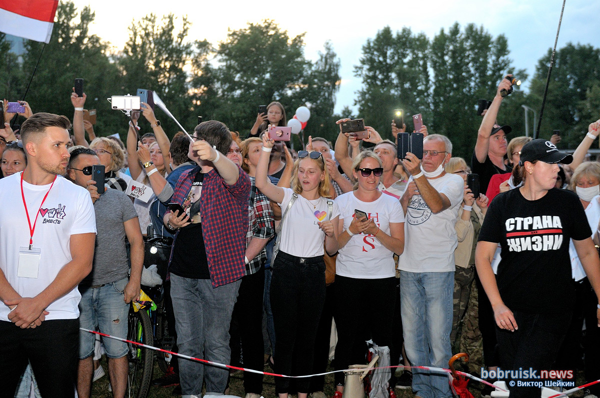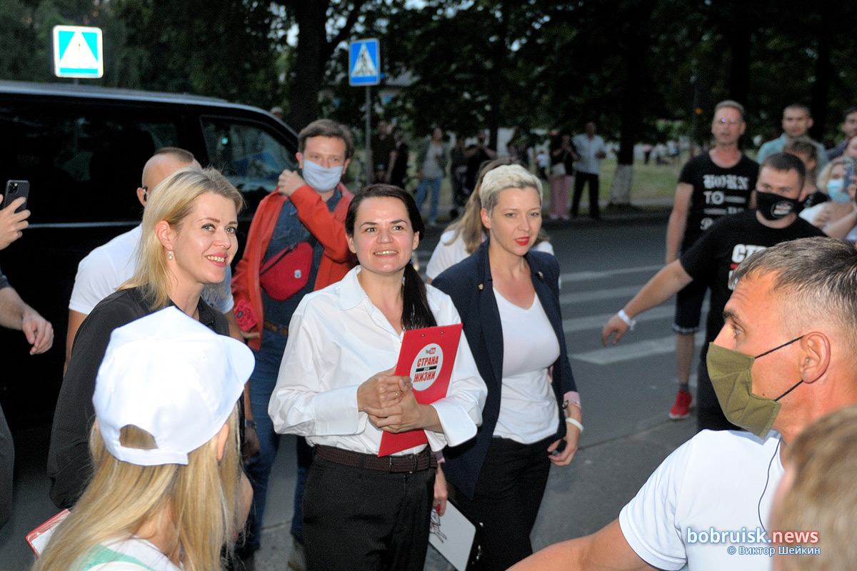 Встреча с бобруйчанами прошла в субботу, 25 июля, на стадионе «Славянки». Вместе со Светланой Тихановской приехали представительницы поддержавших ее штабов: Вероника Цепкало (супруга экс-претендента на высший государственный пост Валерия Цепкало) и Мария Колесникова (представитель штаба другого не утвержденного претендента – Виктора Бабарико).
