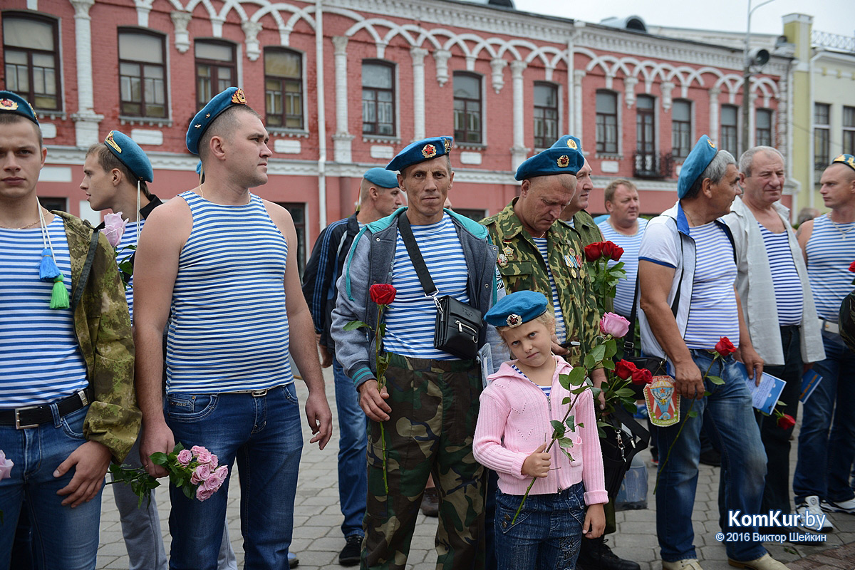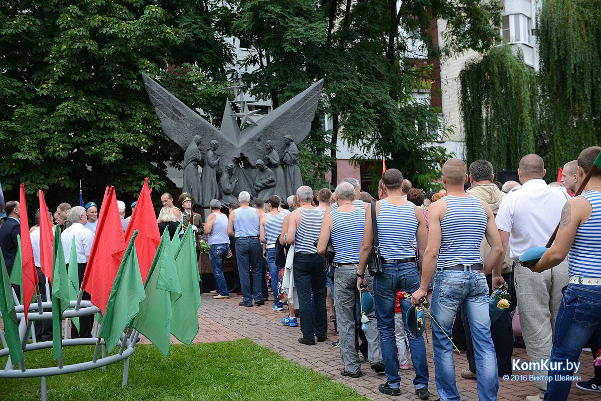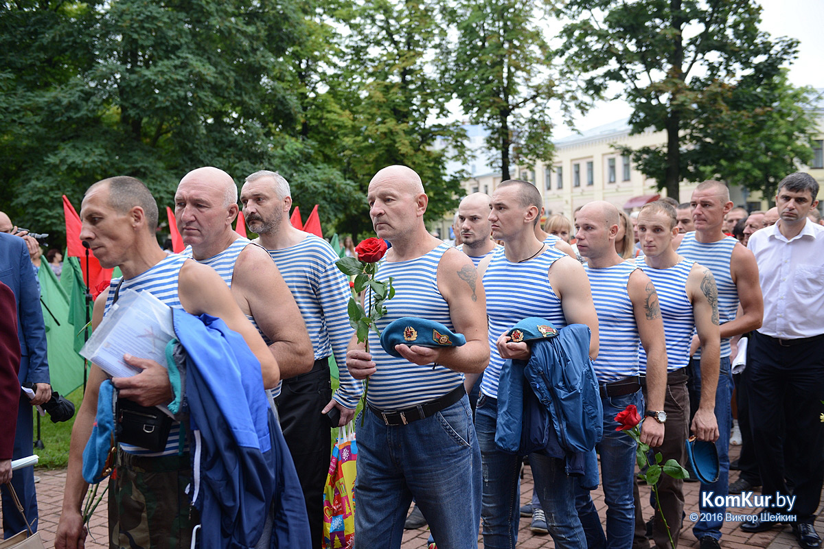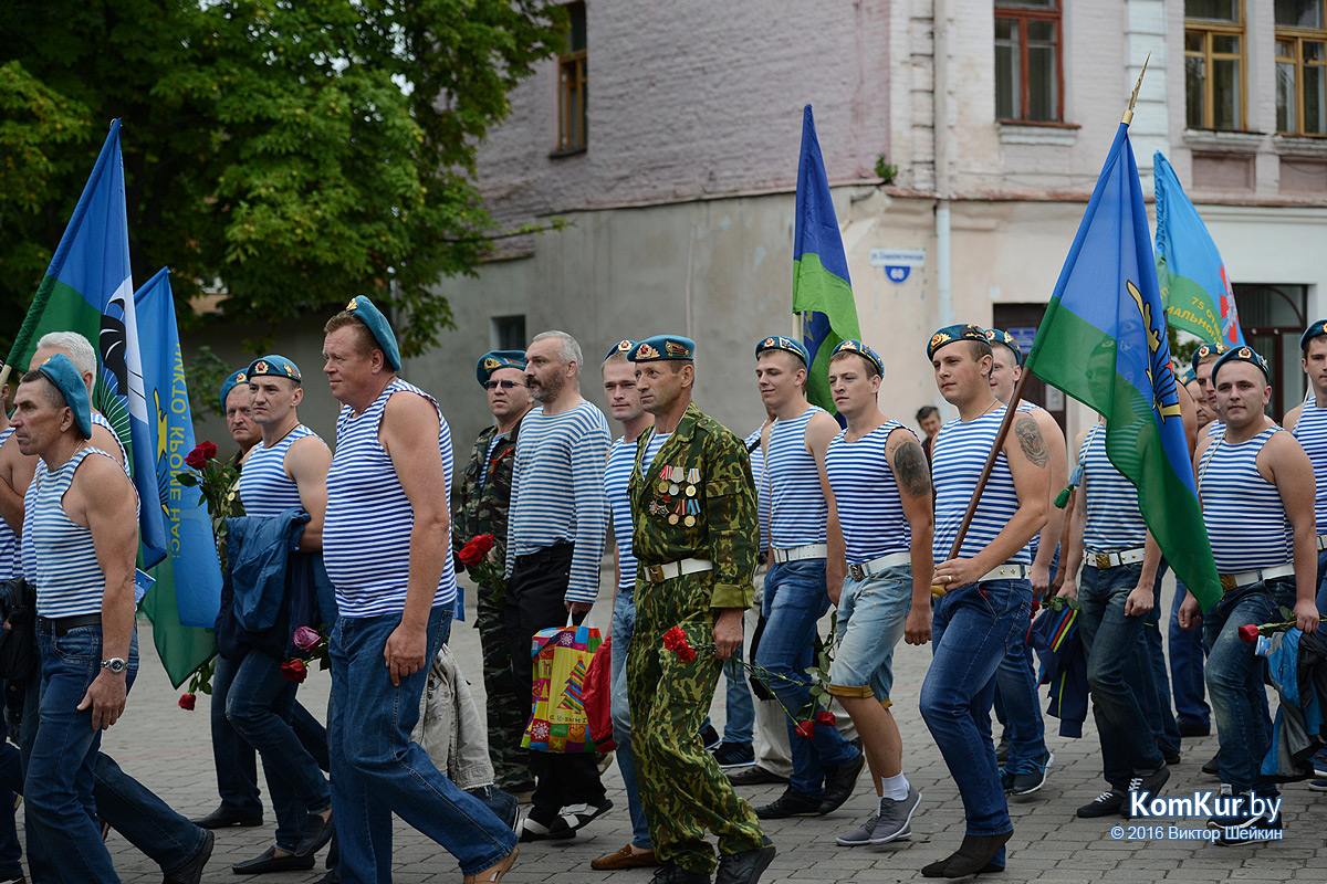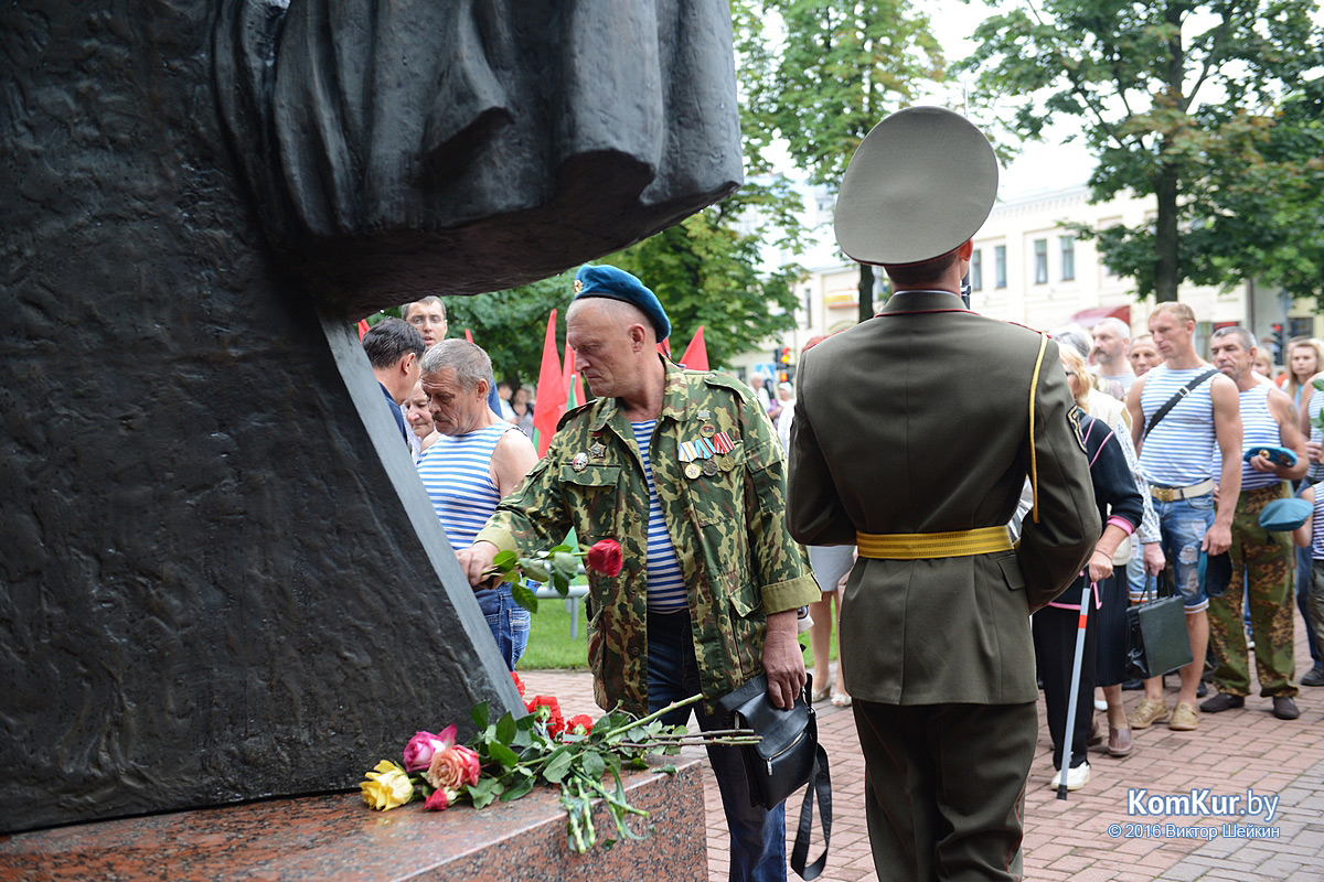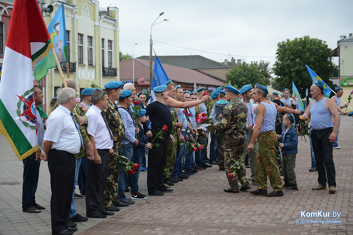 В 10 часов около сотни бойцов от убеленных сединами воинов-интернационалистов и до безусых парней стали в строй на площади Победы, чтобы возложить цветы защитникам Отечества в годы Великой Отечественной войны. После этого десантники отправились к памятнику воинам-интернационалистам на улице Социалистической, где прошел митинг, посвященный празднованию Дня ВДВ и ССО. Мужчин в тельняшках поздравил председатель БГООО «Белорусского союза ветеранов войны в Афганистане» Валерий Лебеденко: