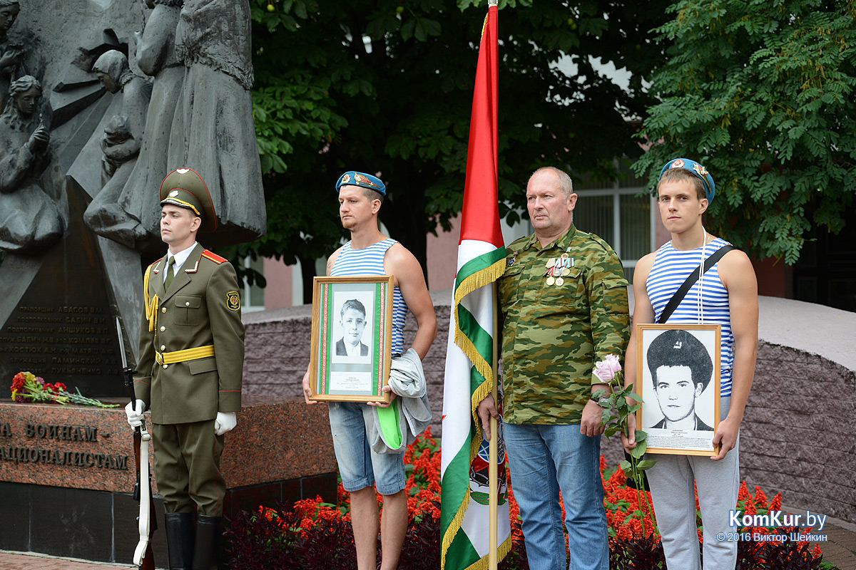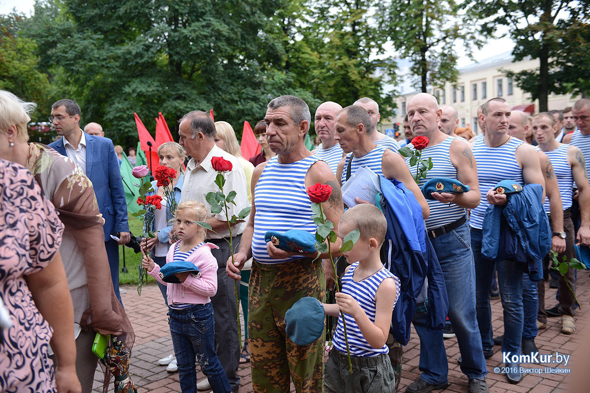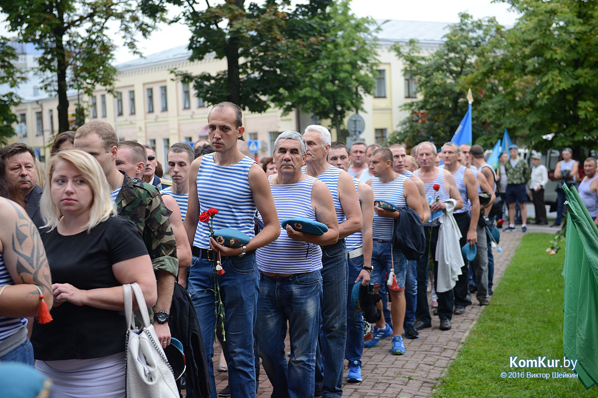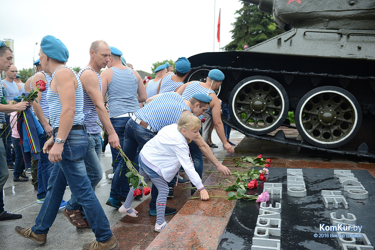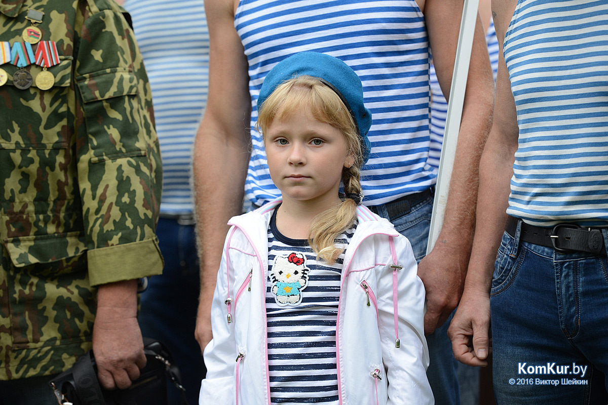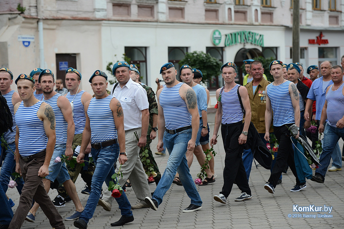 В 10 часов около сотни бойцов от убеленных сединами воинов-интернационалистов и до безусых парней стали в строй на площади Победы, чтобы возложить цветы защитникам Отечества в годы Великой Отечественной войны. После этого десантники отправились к памятнику воинам-интернационалистам на улице Социалистической, где прошел митинг, посвященный празднованию Дня ВДВ и ССО. Мужчин в тельняшках поздравил председатель БГООО «Белорусского союза ветеранов войны в Афганистане» Валерий Лебеденко: