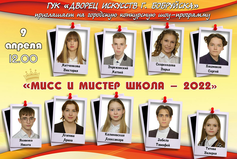 9 апреля в 12.00 в ГУК «Дворец искусств» состоится городской конкурс «Мисс и мистер Школа 2022». Пять девушек и четыре парня, учащиеся 7-11 классов из СШ №18, 19, 20, 28, 32 и 35 будут соревноваться за титулы.