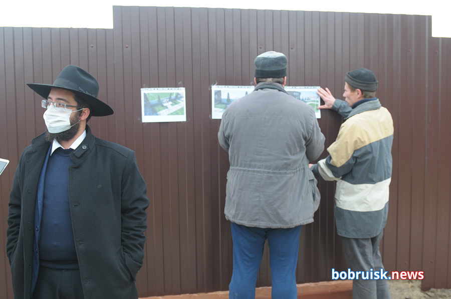 Место установки памятного знака закрыли забором, на самом ограждении прикрепили эскизы – любой из пришедших мог не только оценить проделанную работу, но и внести свои предложения: что-то изменить, добавить. Об этом позже сказал раввин Бобруйска Шауль Хабабо.