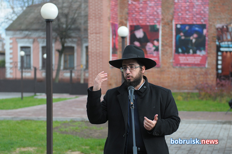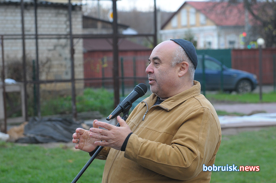 К микрофону выходили: «ребенок войны» Фаина Петровна Палей – с воспоминаниями военного детства, зам. председателя иудейской религиозной общины в Бобруйске Олег Валерьевич Красный – с экскурсом в историю, рассказом о самом знаке и о планах по дальнейшему экспонатному наполнению «Еврейского дворика», профессиональный музыкант, певец Михаил Гутин – со своей семейной историей, причастной к событию, и с душевной песней. И, конечно, сам духовный лидер бобруйских евреев Шауль Хабабо. Раввин подробно описал знак, рассказал о работе над ним: было около двадцати вариантов – все хотелось уйти от простого символизма и нащупать что-то по-настоящему проникновенное, всеобъемлющее, включающее и трагизм потерянных жизней, и возрождение для новой, счастливой жизни. «Смотрите, обсуждайте, предлагайте. Больше мнений – лучше в итоге получится».