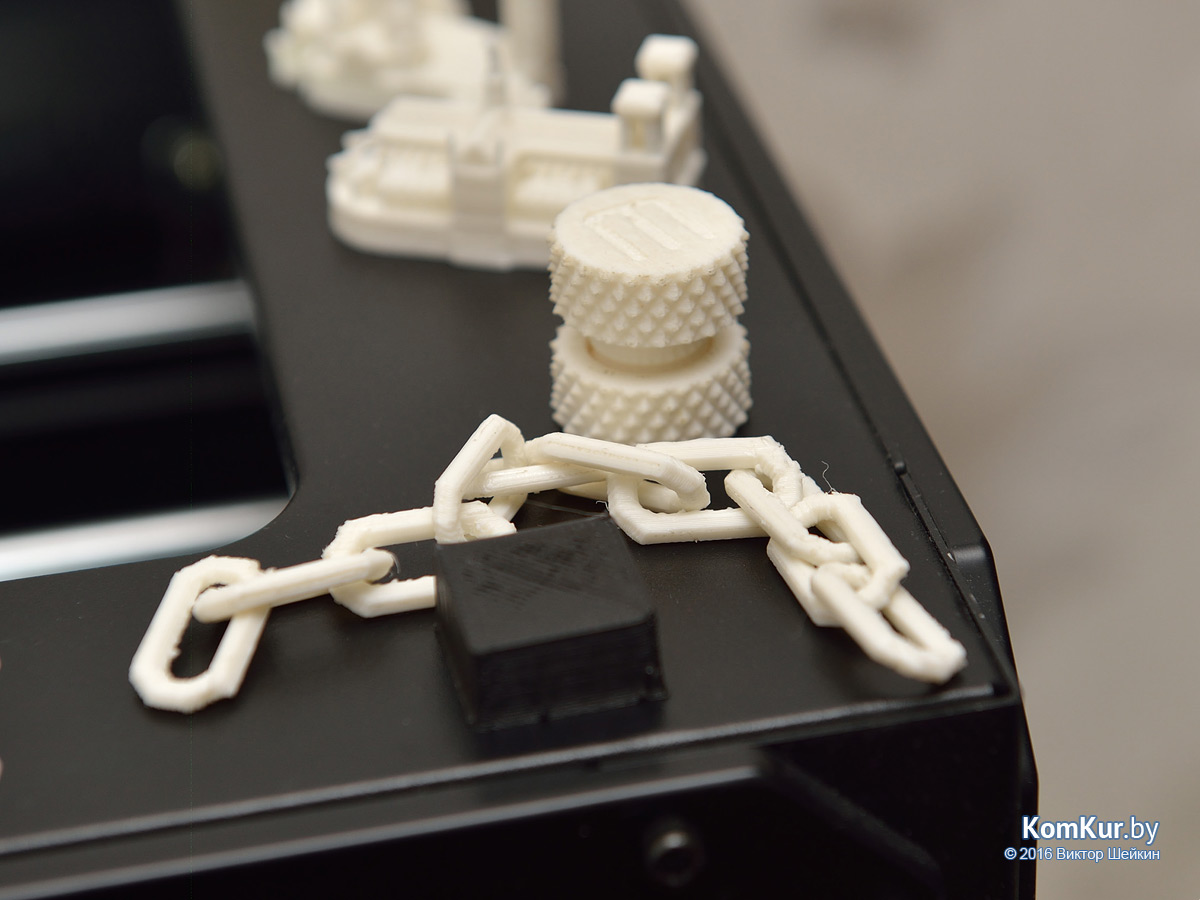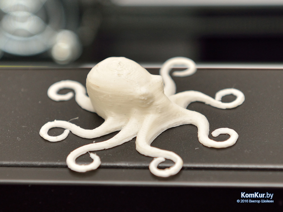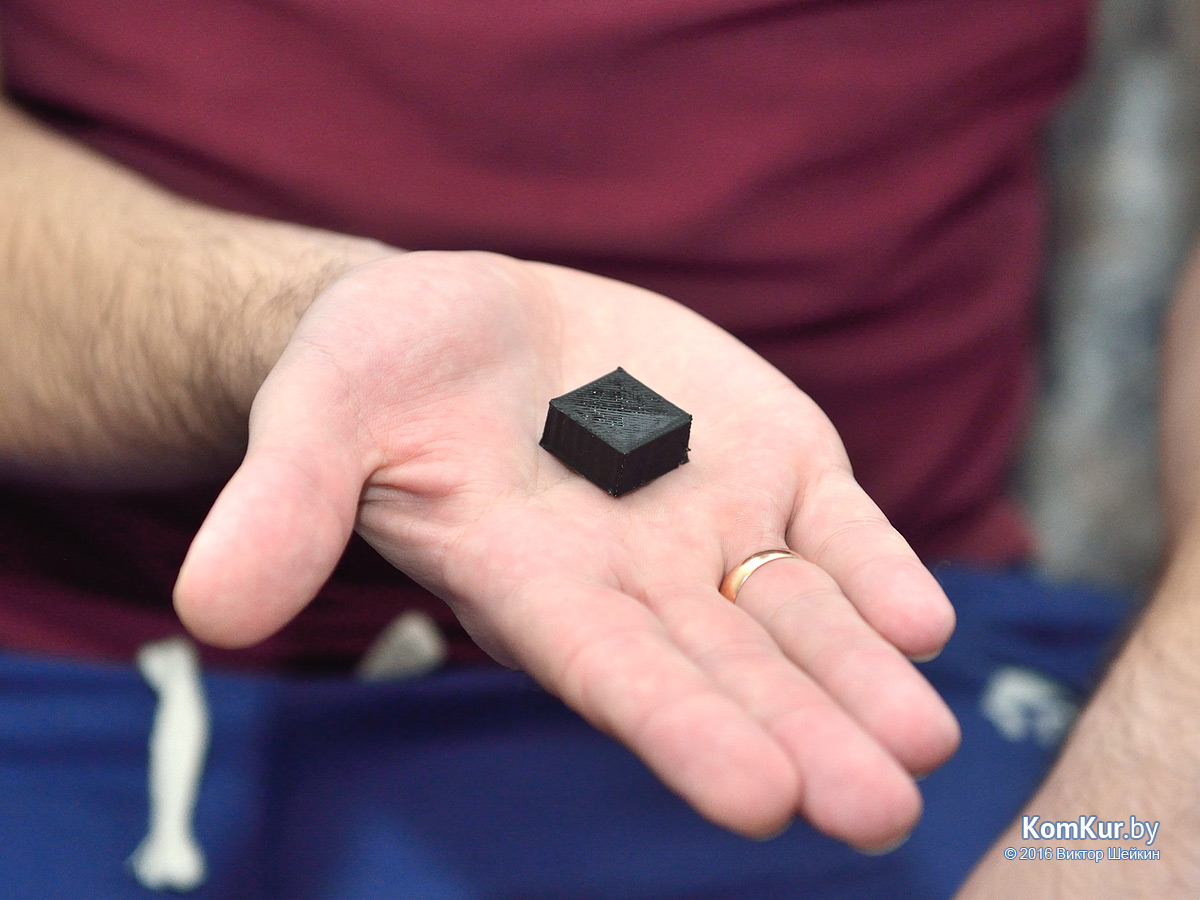 За 15 минут на наших глазах чудо-принтер распечатал «кирпичик» размером 20х20х10 мм. На горизонтальную поверхность слой за слоем выдавливались пластиковые нити. Буквально сразу готовое изделие можно было держать в руках. По словам хозяина, устройство работает от розетки через блок питания в 200 Вт и в принципе может печатать хоть несколько суток без остановки.