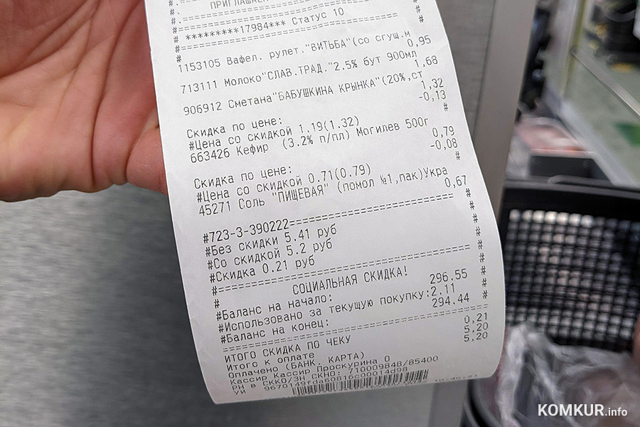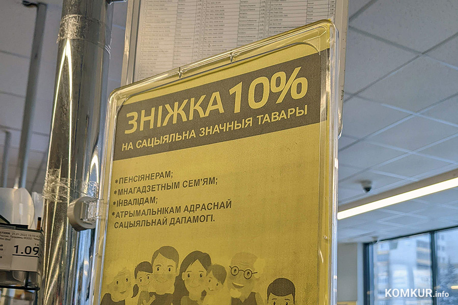 «Сацыяльная зніжка!» — гласит табличка на кассе в магазине «Мартин». Адресаты — все те же. «Надо предъявить документ, который подтверждает право на скидку в 10%», — поясняет кассир.