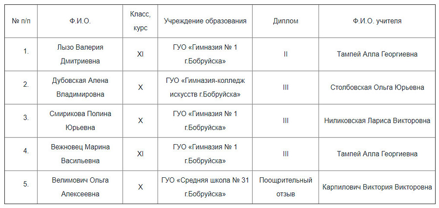 По итогам областного этапа учащиеся города завоевали 80 дипломов. Из них I степени – 12; II степени – 22; III степени – 30 дипломов. Кроме того, бобруйчане удостоены 16 поощрительных дипломов.
