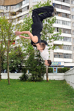 «Моя история паркура началась еще класса с третьего, — рассказывает Павел Дрозд. — Когда в секции рукопашного боя мы стали отрабатывать прыжки, кувырки». Свое первое переднее сальто он сделал в зале на матах. Павел решил усовершенствовать процесс приземления после прыжка через преграду. Приземлиться на ноги получилось не сразу.