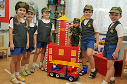 …Сначала была комната. Серая и скучная. Но разве может что-то долго пустовать у рачительного хозяина? Так произошло и с подсобным помещением у заведующей 65-м садиком Татьяны Владимировны Романюк: комнату было решено переделать в игровую с акцентом на пожарно-спасательное дело. Малыши здесь не просто веселятся — через игру узнают основные правила безопасности. Тут тебе и мини-макет города, где картонные здания (ростом с ребенка) поликлиники, пожарной части, Интернет-клуба, церкви со сверкающими куполами… Как любопытно тут, наверное, проехать на игрушечной машине да еще по дорожной разметке, мимо светофоров и сотрудников ГАИ. Каждый день ребята разыгрывают здесь различные ситуации.