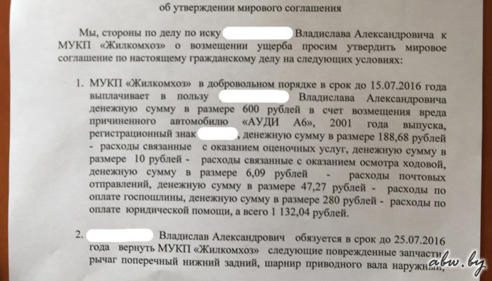 "Я поехал в Могилев. Нанял там адвоката, который сразу сказал, что мы должны выиграть. В принципе, так и произошло – первое слушание все сразу показало. Коммунальщики признали себя виновными. Просто судья адекватный попался. Он говорит: "Факт выбоины есть? Есть. Виноваты? Виноваты. Значит, платите деньги".