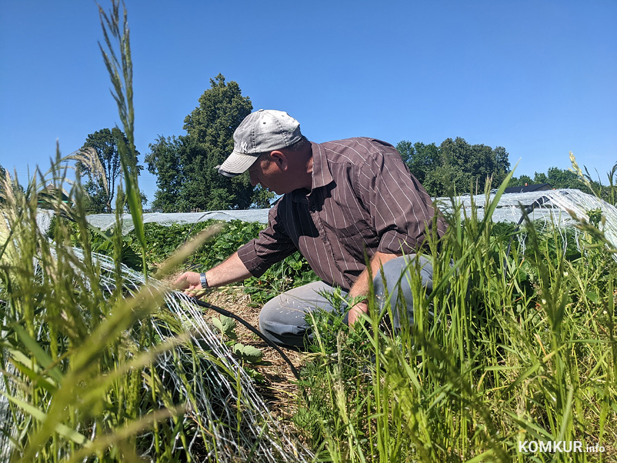 — Много лет работал прорабом в ДСУ №16. Постоянно в командировках, дома только по выходным. Пару лет назад задумался о смене работы. Сейчас учусь на землеустроителя в Горецкой академии, осталось полтора года. Уволившись, нашел работу охранника, сутки через трое, чтобы иметь свободное время для работы в хозяйстве. Мы с женой договорились, что с клубникой пробуем в течение двух сезонов. Потом садимся с калькулятором, считаем и решаем, есть ли смысл ею заниматься. Почему клубника? Был отцовский опыт, какая-то база. Но, ясное дело, по старинке работать не получается — хотя бы потому, что климат стал засушливее. Без автоматического полива — никуда.